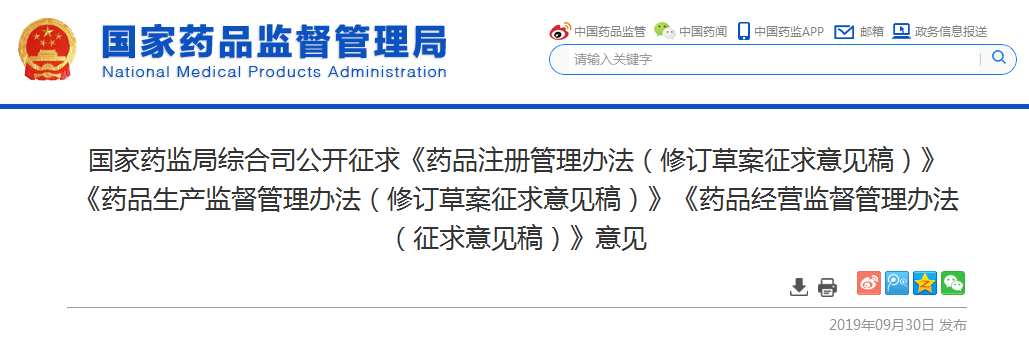 國家藥監(jiān)局綜合司公開征求《藥品注冊管理辦法(修訂草案征求意見稿)》《藥品生產(chǎn)監(jiān)督管理辦法(修訂草案征求意見稿)》《藥品經(jīng)營監(jiān)督管理辦法(征求意見稿)》意見