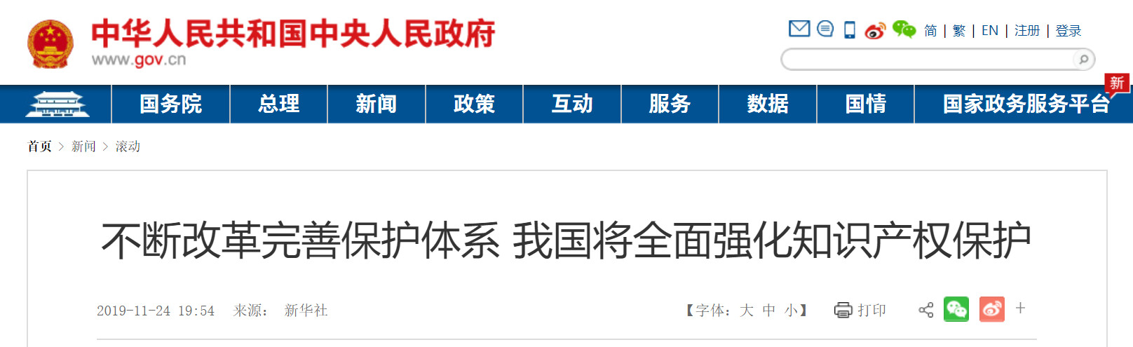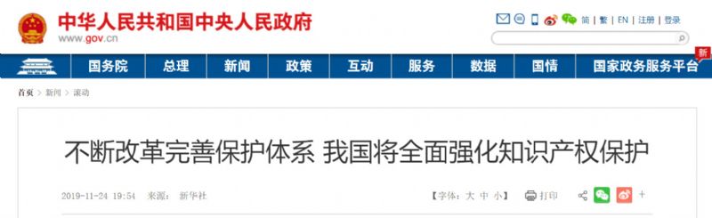 新華社北京11月24日電(記者 張泉)近日,中共中央辦公廳、國務(wù)院辦公廳印發(fā)《關(guān)于強化知識產(chǎn)權(quán)保護的意見》,明確要不斷改革完善知識產(chǎn)權(quán)保護體系,綜合運用法律、行政、經(jīng)濟、技術(shù)、社會治理手段強化保護,促進保護能力和水平整體提升。