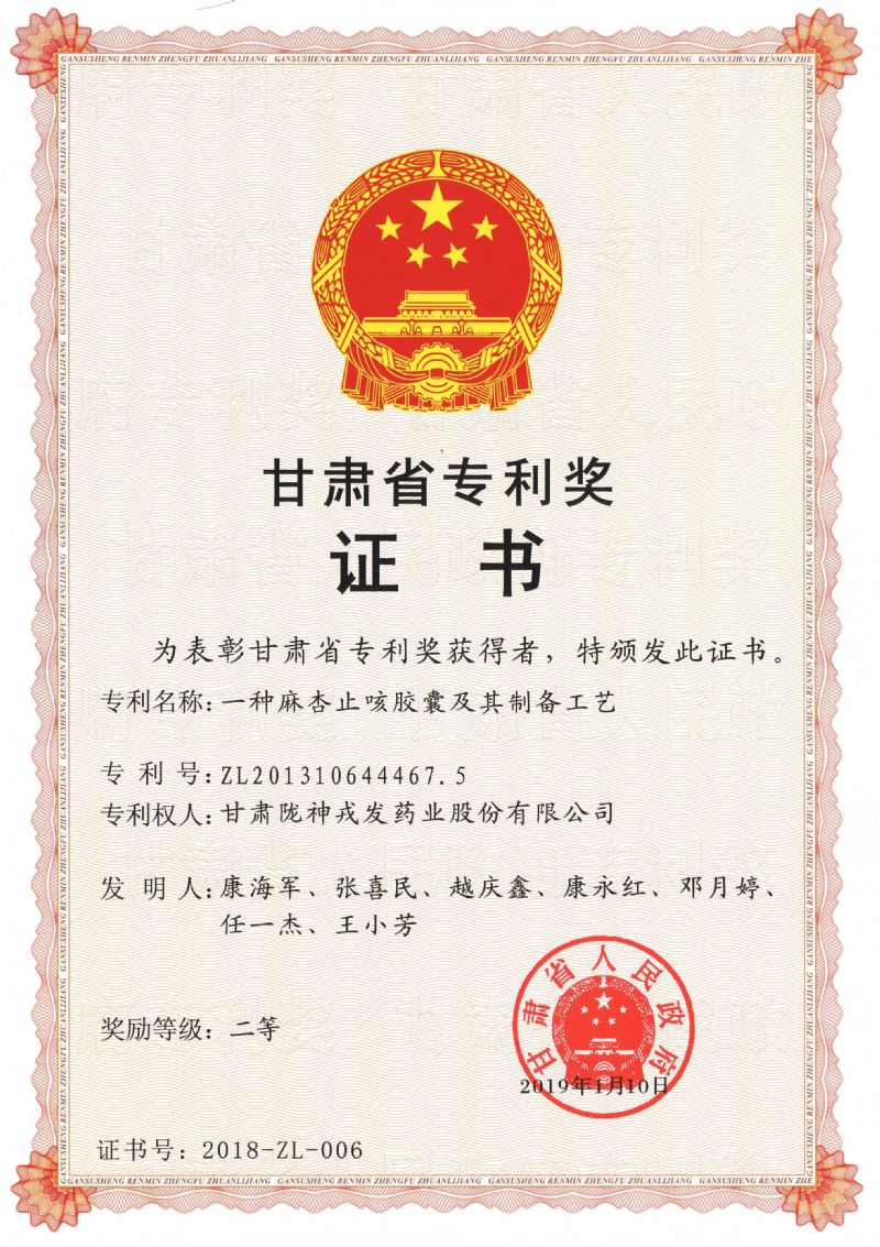 2月14日,甘肅省科學(xué)技術(shù)專利獎勵大會在寧臥莊賓館隆重召開。隴神戎發(fā)發(fā)明專利“一種麻杏止咳膠囊及其制備工藝”榮獲2018年甘肅省專利獎二等獎。此次獲獎專利中,一等獎5項,二等獎20項,三等獎25項。