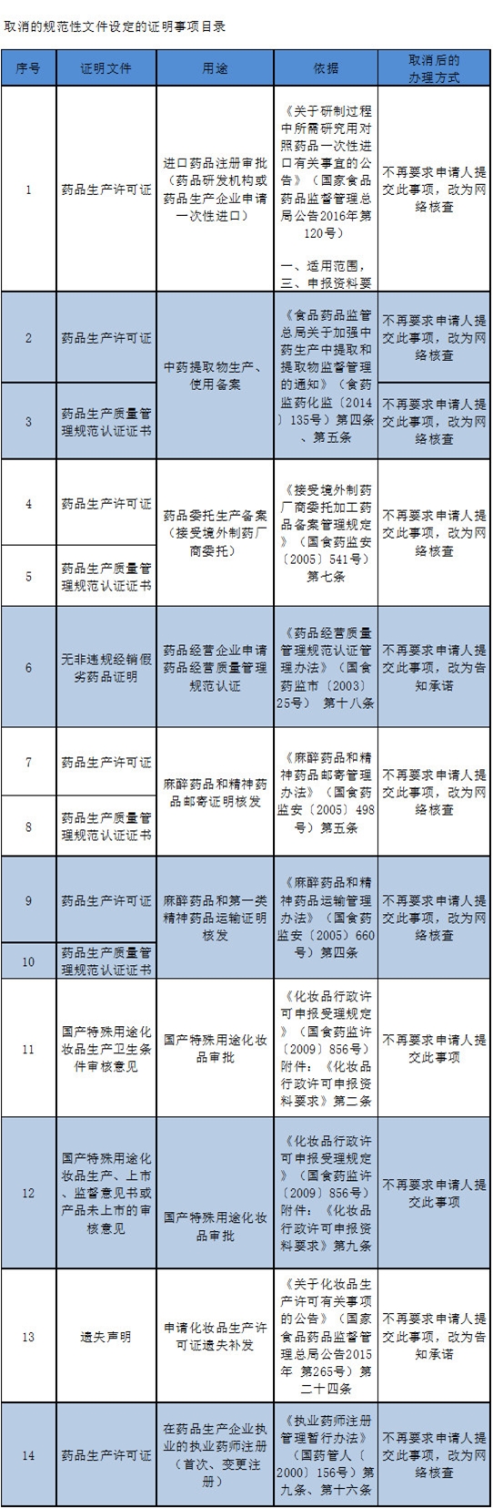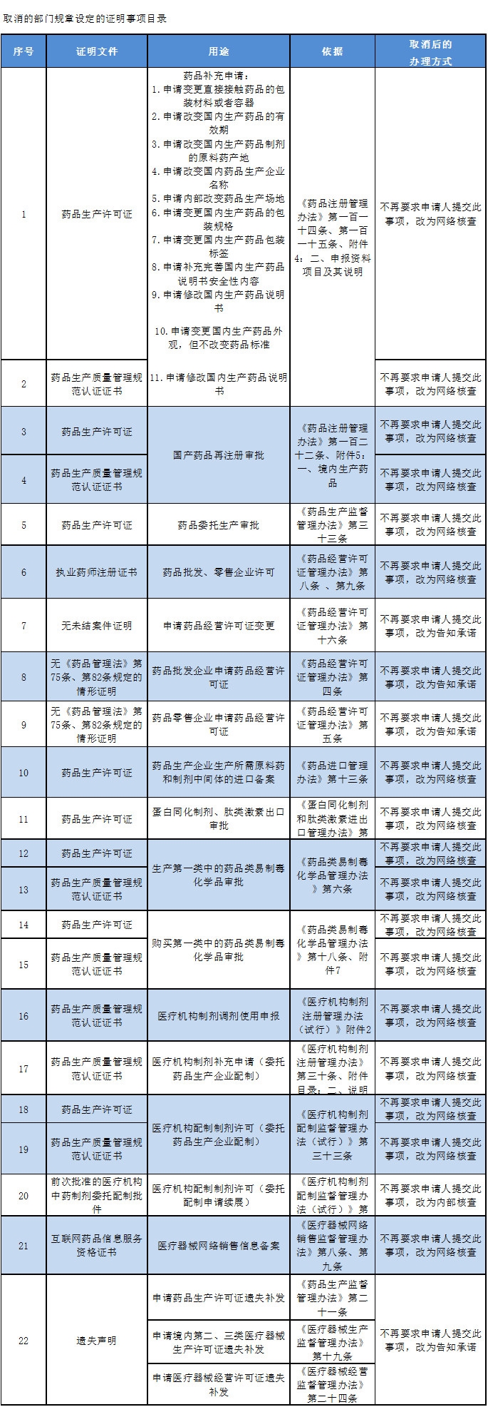 36項(xiàng)證明事項(xiàng)包括14項(xiàng)“規(guī)范性文件設(shè)定的證明事項(xiàng)”和24項(xiàng)“部門規(guī)章設(shè)定的證明事項(xiàng)”。很多事項(xiàng),不再要求申請(qǐng)人提交此,改為網(wǎng)絡(luò)核查。涉及到藥品生產(chǎn)許可證、執(zhí)業(yè)藥師注冊(cè)證書等諸多方面。