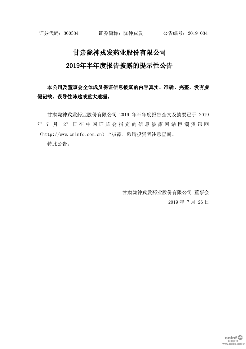 2019年半年度報(bào)告披露的提示性公告