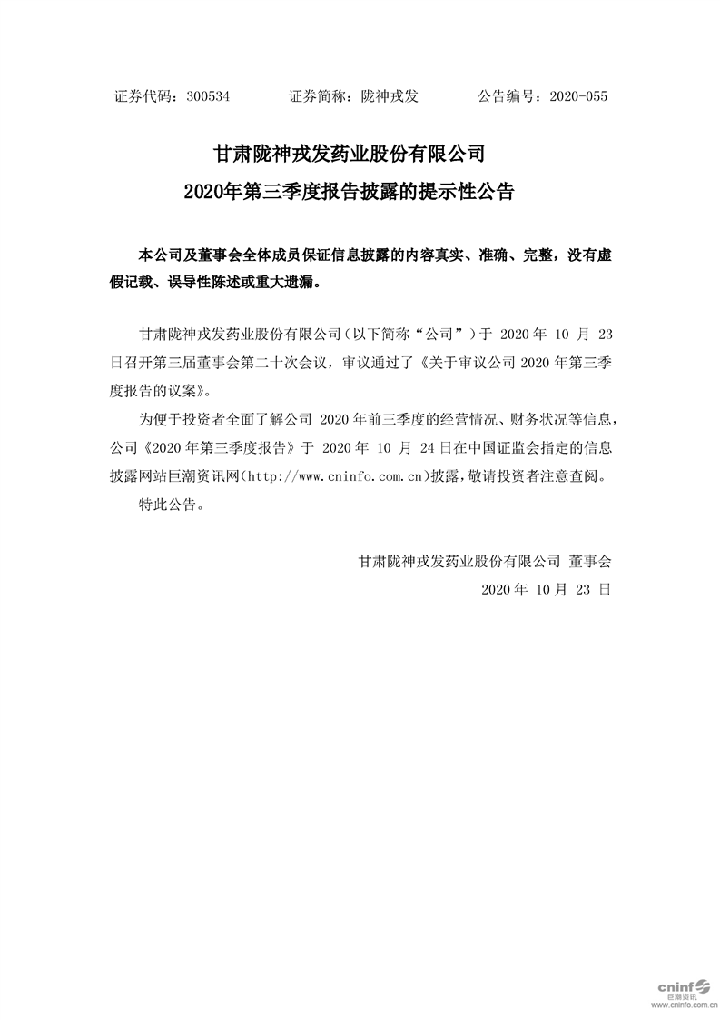 2020年第三季度報告披露的提示性公告