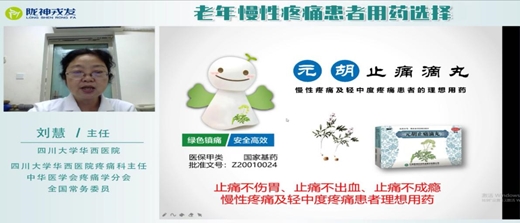 19日下午正式開展線上“慢性疼痛與輕中度疼痛專家交流會”,首場直播邀請到中華醫(yī)學(xué)會疼痛學(xué)會分會全國常務(wù)委員、四川大學(xué)華西醫(yī)院疼痛科主任劉慧教授主講《老年慢性疼痛患者用藥選擇》,劉主任強(qiáng)調(diào)老年患者往往會存在肝腎功能不全等問題,目前廣泛使用的NSAIDs類藥物會導(dǎo)致消化道、心血管、肝腎功能的不良反應(yīng),而元胡止痛滴丸止痛不傷胃、止痛不出血、止痛不成癮的優(yōu)勢更適用于老年慢性疼痛。