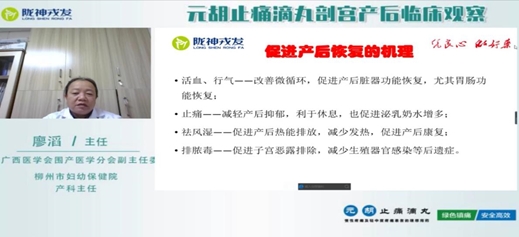 線上交流會第二場邀請到廣西醫(yī)學(xué)會圍產(chǎn)醫(yī)學(xué)分會副主任委員、柳州市婦幼保健院產(chǎn)科主任廖滔教授主講《元胡止痛滴丸剖宮產(chǎn)后臨床觀察》,廖滔主任從病理生理過程講解產(chǎn)后疼痛的特點(diǎn)、從病理生理進(jìn)行藥物分析,從止痛的機(jī)理講解元胡止痛滴丸促進(jìn)產(chǎn)后恢復(fù)的優(yōu)勢,最后從臨床實(shí)例分享元胡止痛滴丸使用的效果。