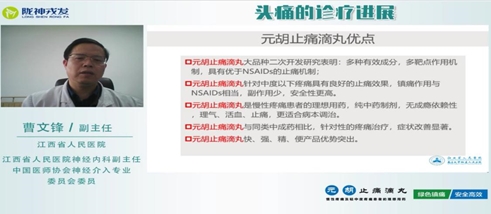 第三場交流會由中國醫(yī)師協(xié)會神經(jīng)介入專業(yè)委員會委員、江西省人民醫(yī)院神經(jīng)內(nèi)科副主任曹文鋒教授主講《原發(fā)性頭疼的診療進(jìn)展》,曹主任總結(jié)頭痛是最常見的臨床癥狀之一,慢性頭痛嚴(yán)重影響到人們生活質(zhì)量,頭痛患者經(jīng)常伴有抑郁癥、焦慮癥以及睡眠障礙等,臨床常用到的藥物副作用大,長期使用會導(dǎo)致藥物過度使用性頭痛,而元胡止痛滴丸含有多種有效成分,能夠多靶點(diǎn)聯(lián)合作用,可以調(diào)節(jié)疼痛機(jī)制的各種神經(jīng)遞質(zhì),兼顧治療心理障礙,且副作用小。