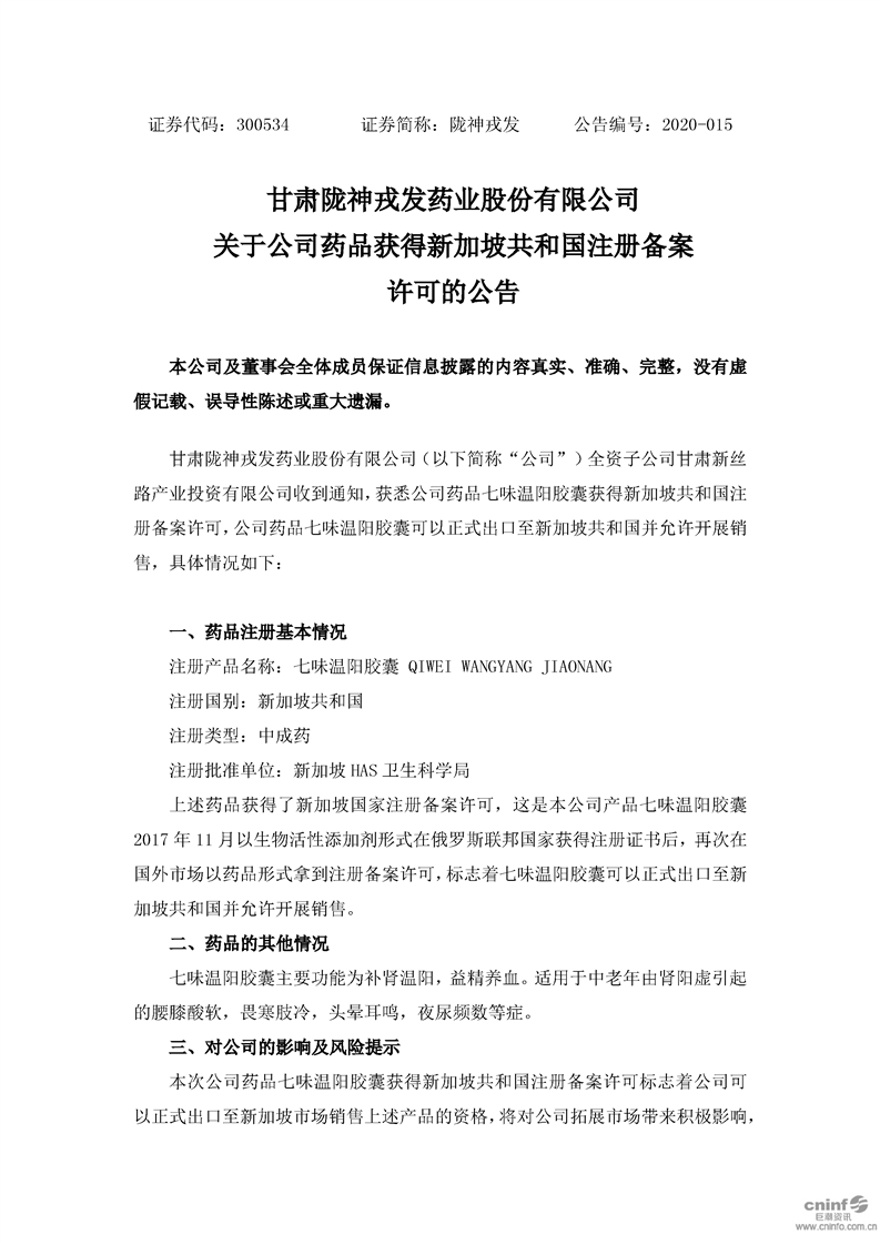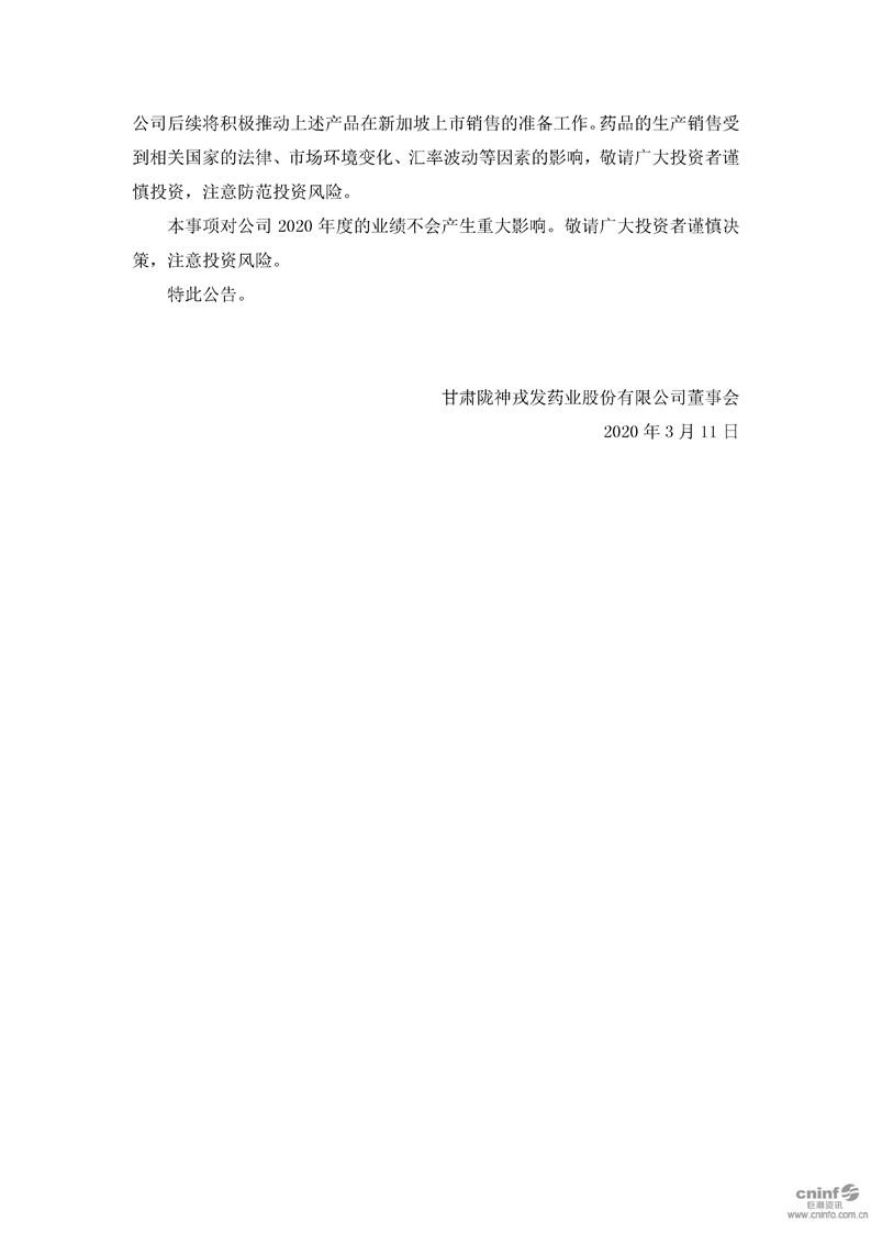 關于公司藥品獲得新加坡共和國注冊備案許可的公告