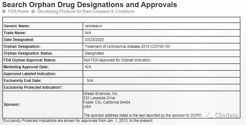 3月23日,F(xiàn)DA官網(wǎng)數(shù)據(jù)庫顯示,FDA授予吉利德科學(Gilead Sciences)公司開發(fā)的在研抗病毒療法瑞德西韋(remdesivir)孤兒藥資格(Orphan Drug Designation),其適應癥為冠狀病毒疾病2019(COVID-19)。
