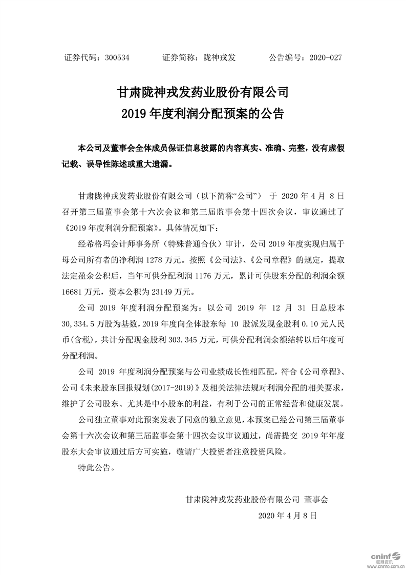 2019年度利潤(rùn)分配預(yù)案的公告