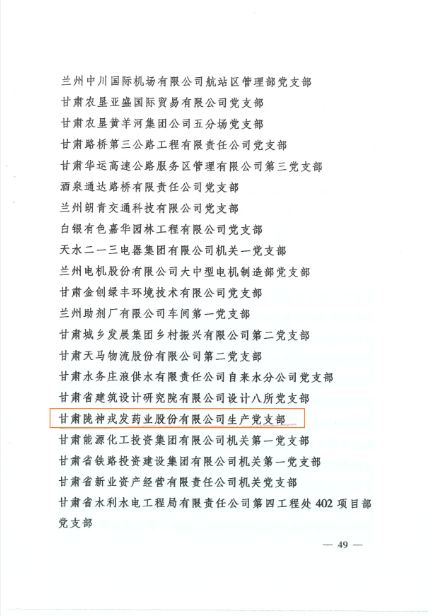 近日,甘肅省委組織部印發(fā)《關(guān)于命名1000個全省標準化先進黨支部的通知》,對在決戰(zhàn)決勝脫貧攻堅、統(tǒng)籌推進疫情防控和經(jīng)濟社會發(fā)展、推動脫貧攻堅與鄉(xiāng)村振興有效銜接等重大任務(wù)、中心工作中涌現(xiàn)出的1000個標準化先進黨支部進行了命名。甘肅隴神戎發(fā)藥業(yè)股份有限公司所屬生產(chǎn)黨支部光榮上榜。