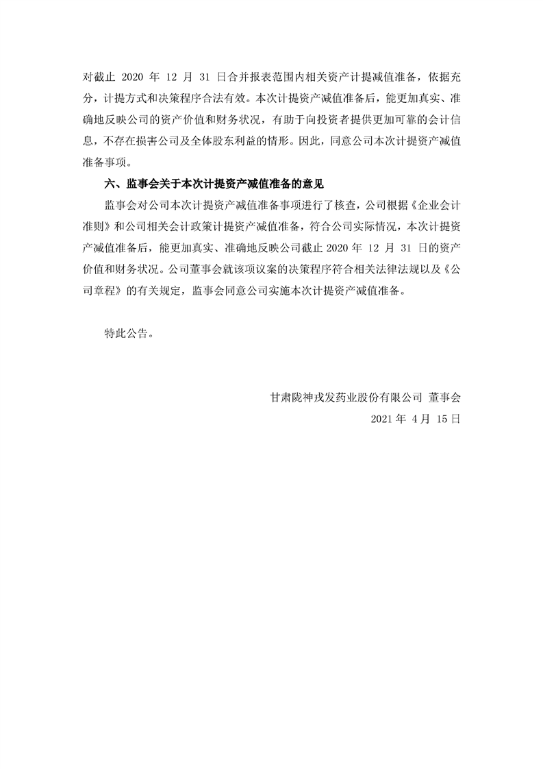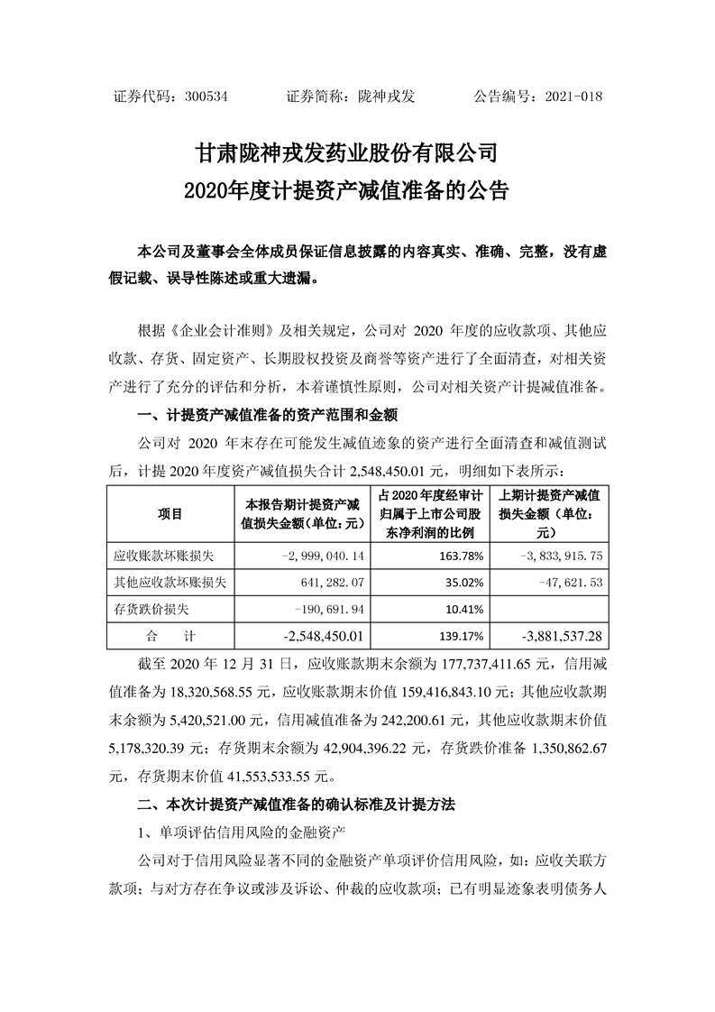 關(guān)于公司2020年度計提資產(chǎn)減值準備的公告