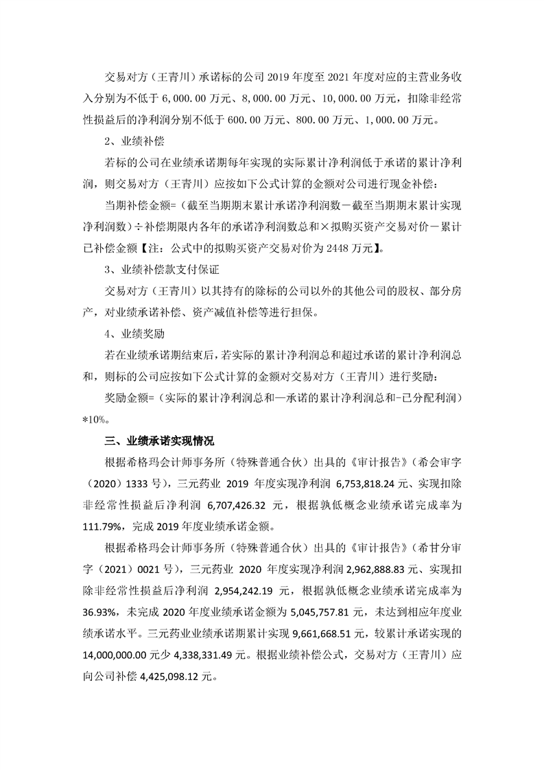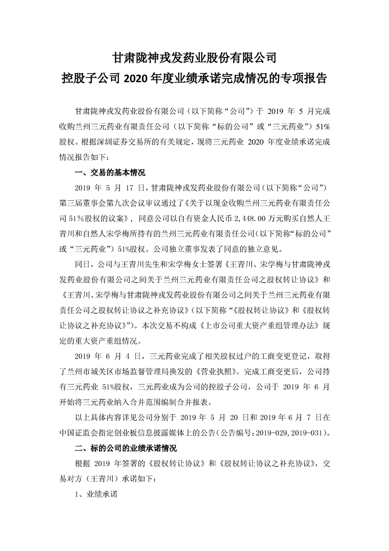 控股子公司2020年度業(yè)績承諾完成情況的專項(xiàng)報告(更新后)