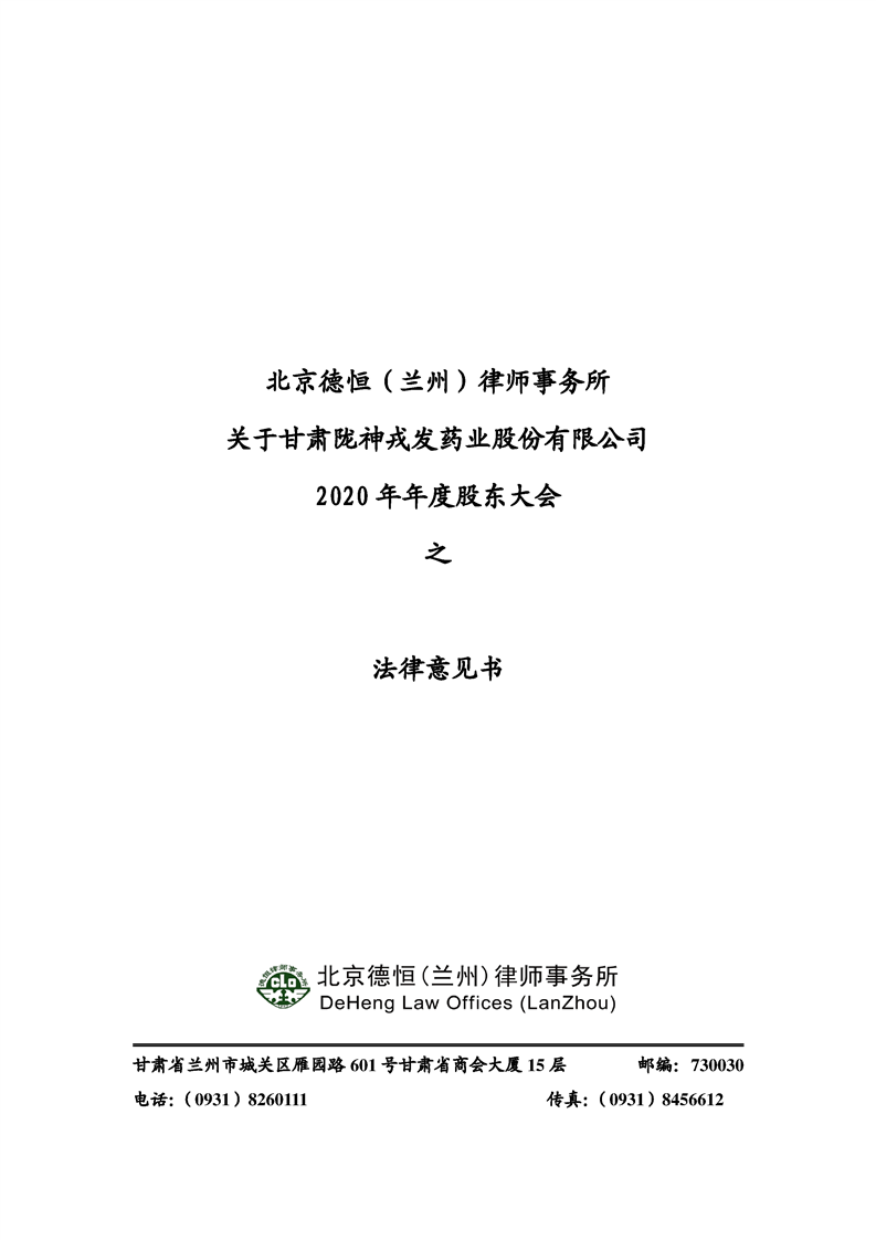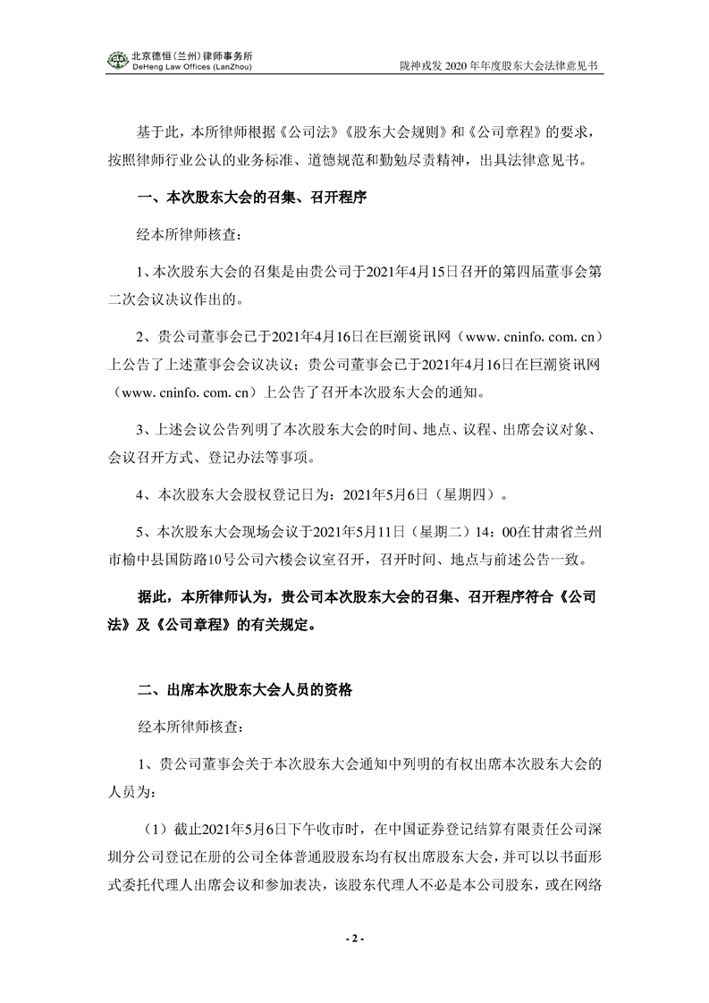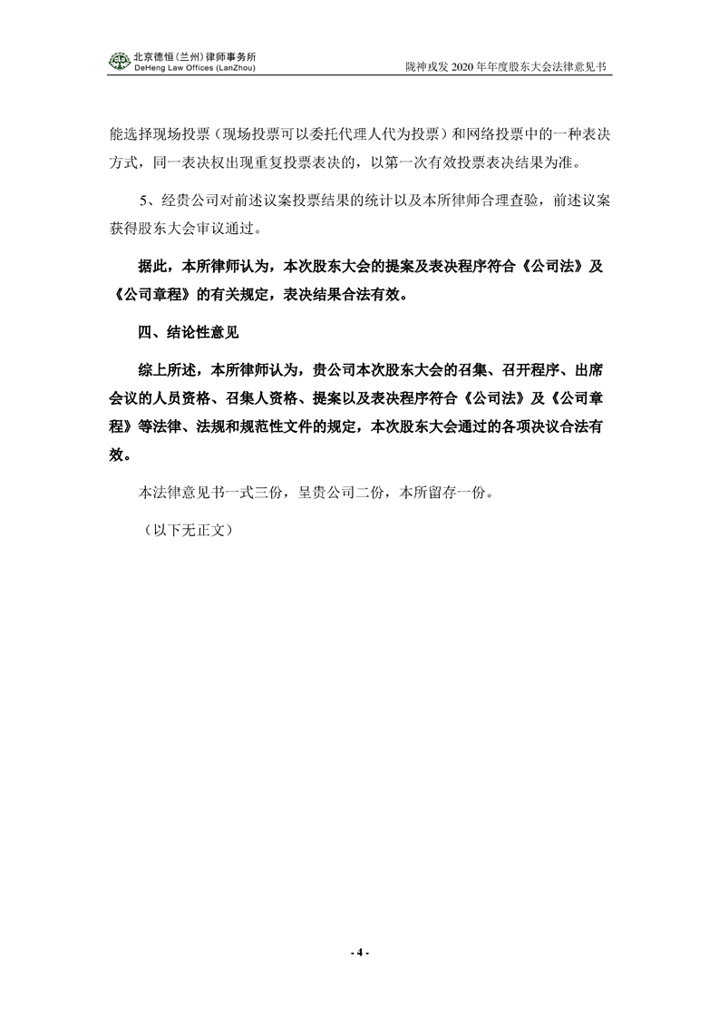 隴神戎發(fā)2020年年度股東大會(huì)法律意見(jiàn)書
