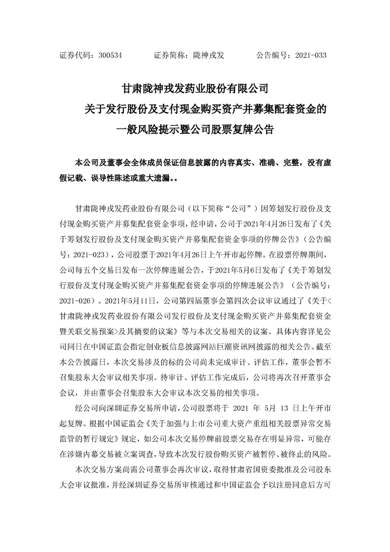 關(guān)于發(fā)行股份及支付現(xiàn)金購買資產(chǎn)并募集配套資金的一般風(fēng)險(xiǎn)提示暨公司股票復(fù)牌公告