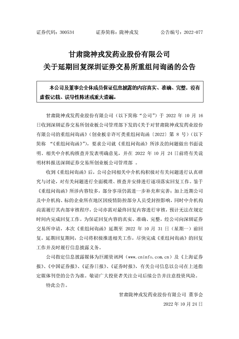 關(guān)于延期回復深圳證券交易所重組問詢函的公告
