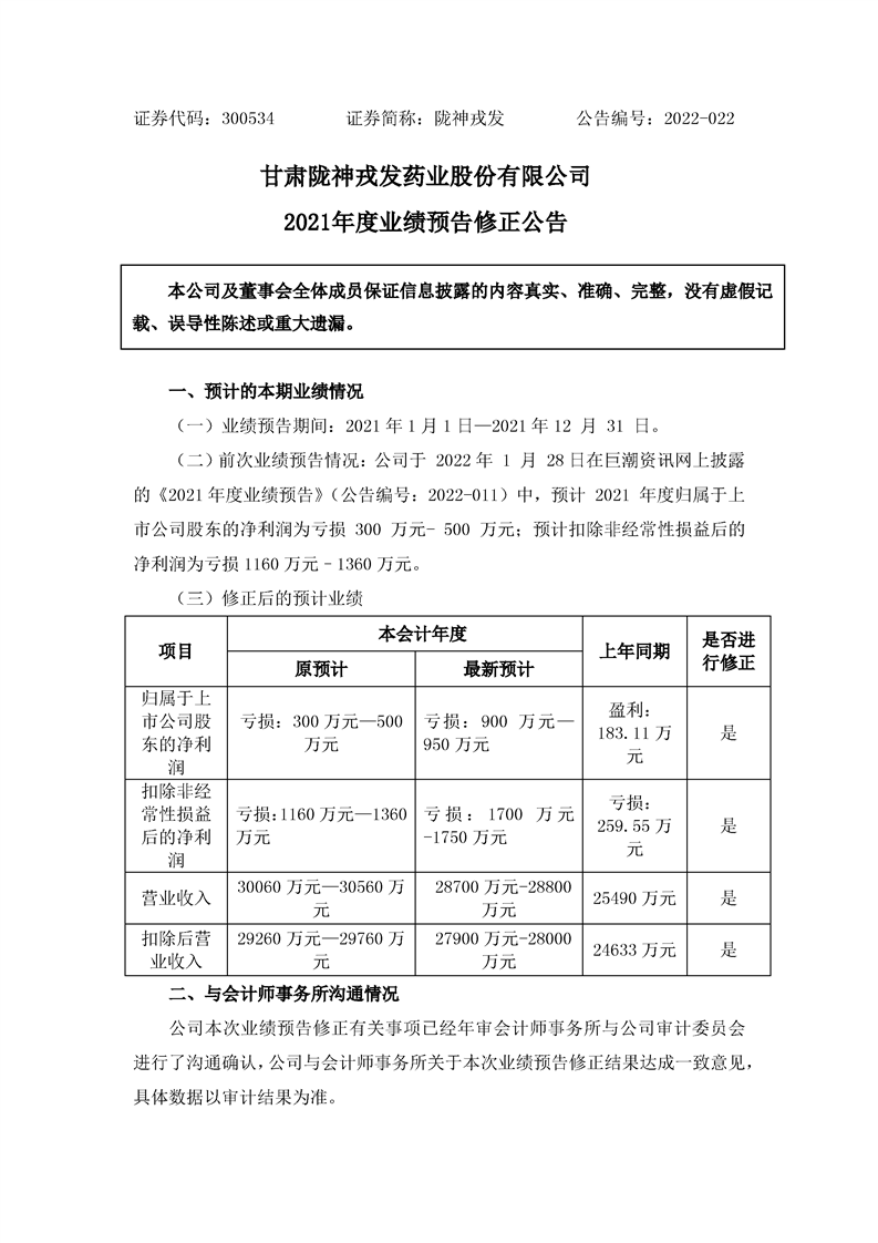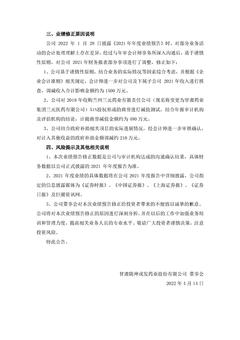 2021年度業(yè)績(jī)預(yù)告修正公告