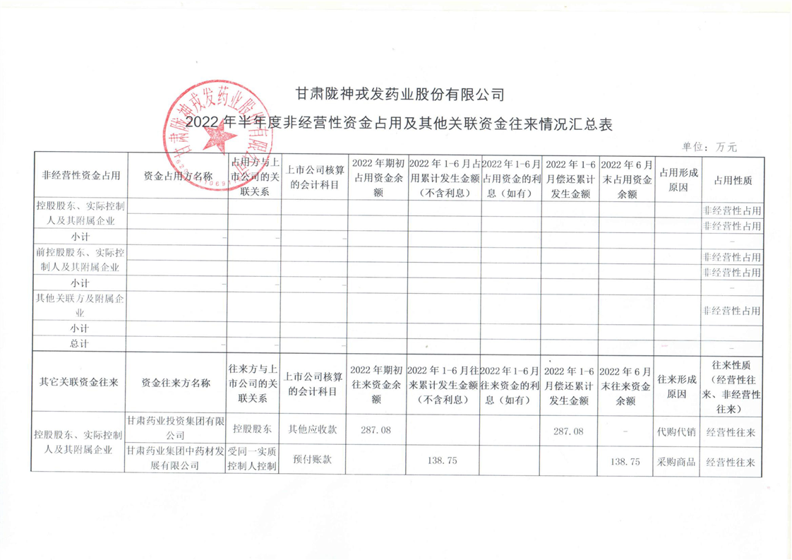 2022年半年度非經(jīng)營性資金占用及其他關(guān)聯(lián)資金往來情況匯總表