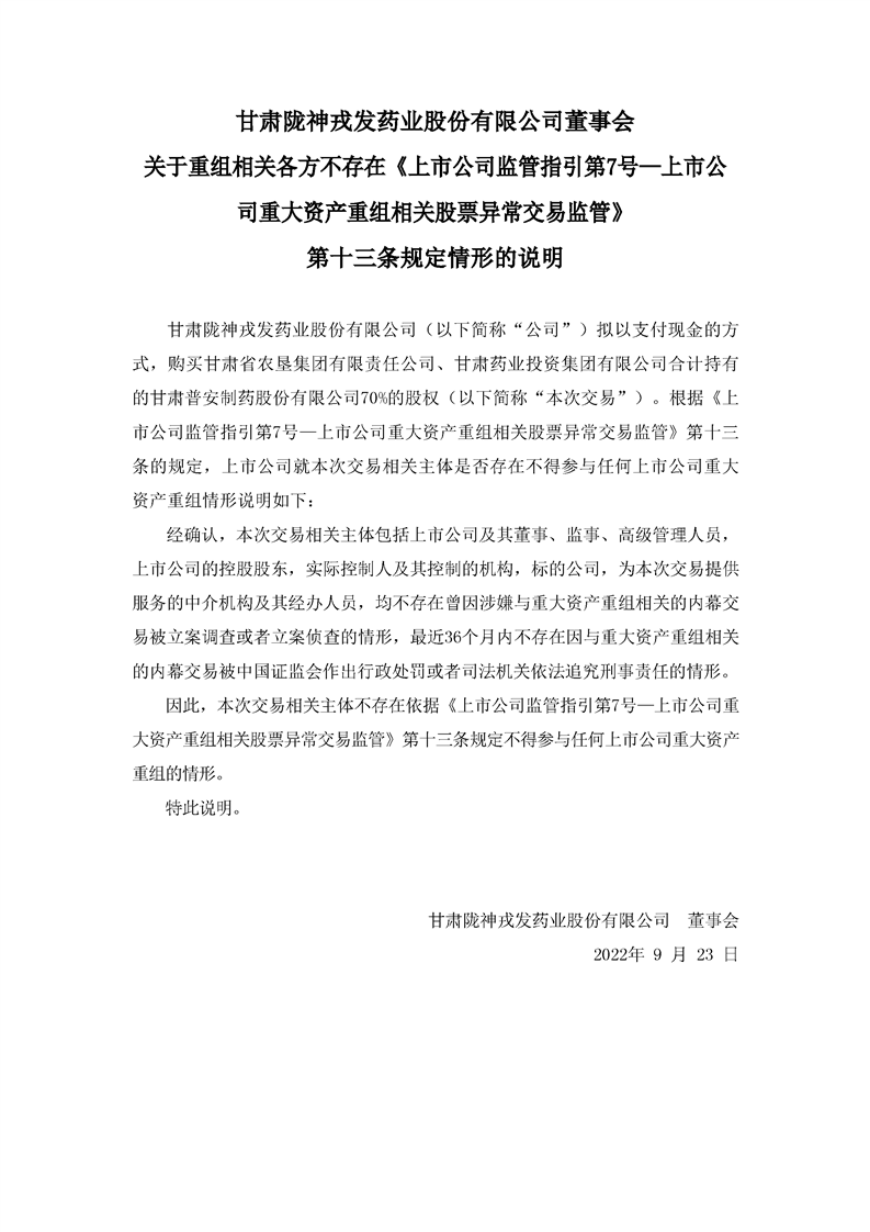 隴神戎發(fā):董事會關(guān)于重組相關(guān)各方不存在《上市公司監(jiān)管指引第7號—上市公司重大資產(chǎn)重組相關(guān)股票異常交易監(jiān)管》第十三條規(guī)定情形的說明