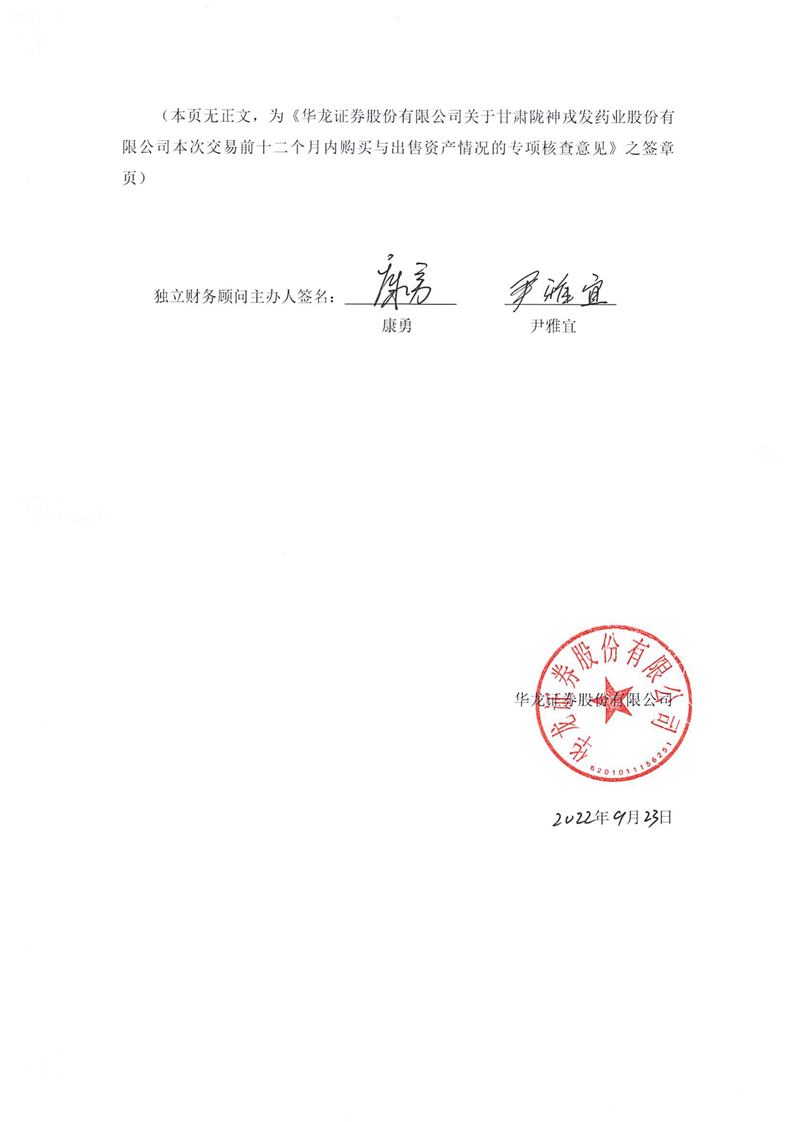 華龍證券股份有限公司關(guān)于甘肅隴神戎發(fā)藥業(yè)股份有限公司本次交易前十二個(gè)月內(nèi)購(gòu)買與出售資產(chǎn)情況的專項(xiàng)核查意見(jiàn)