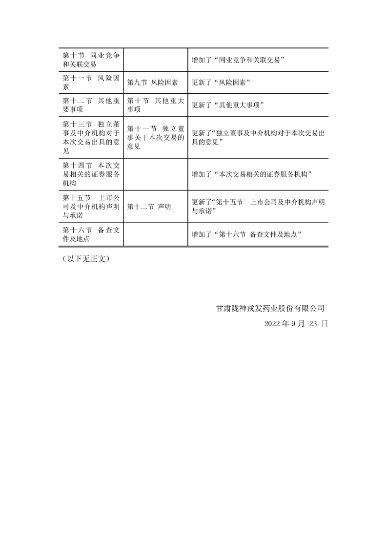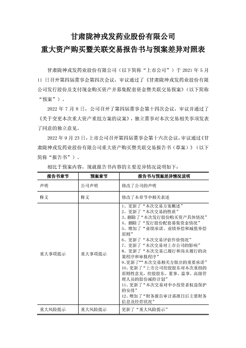甘肅隴神戎發(fā)藥業(yè)股份有限公司重大資產(chǎn)購(gòu)買暨關(guān)聯(lián)交易報(bào)告書與預(yù)案差異對(duì)照表