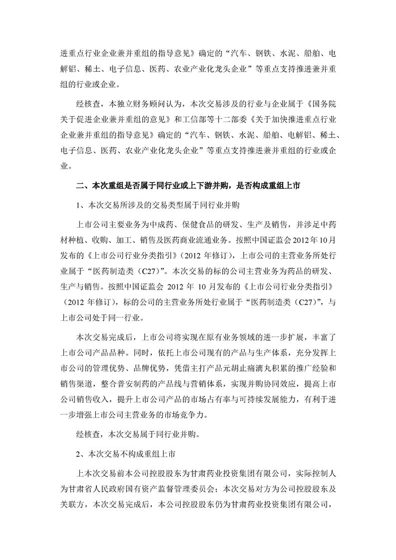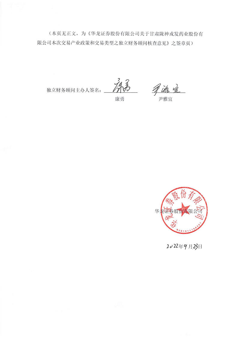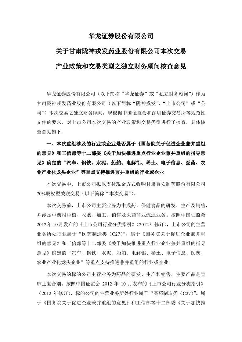 華龍證券股份有限公司關于甘肅隴神戎發(fā)藥業(yè)股份有限公司本次交易產業(yè)政策和交易類型之獨立財務顧問核查意見