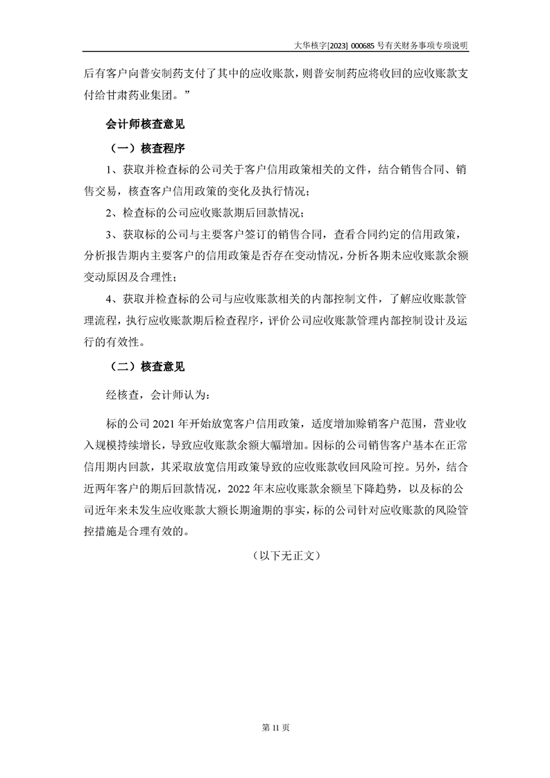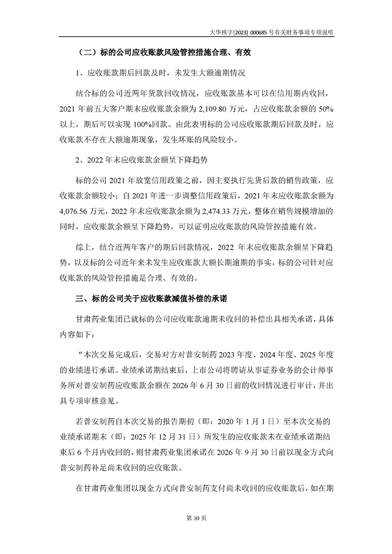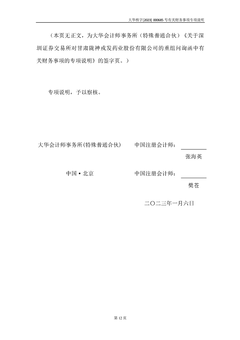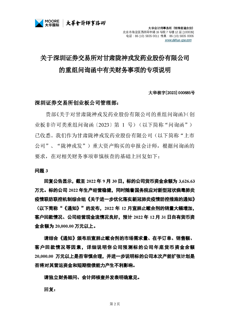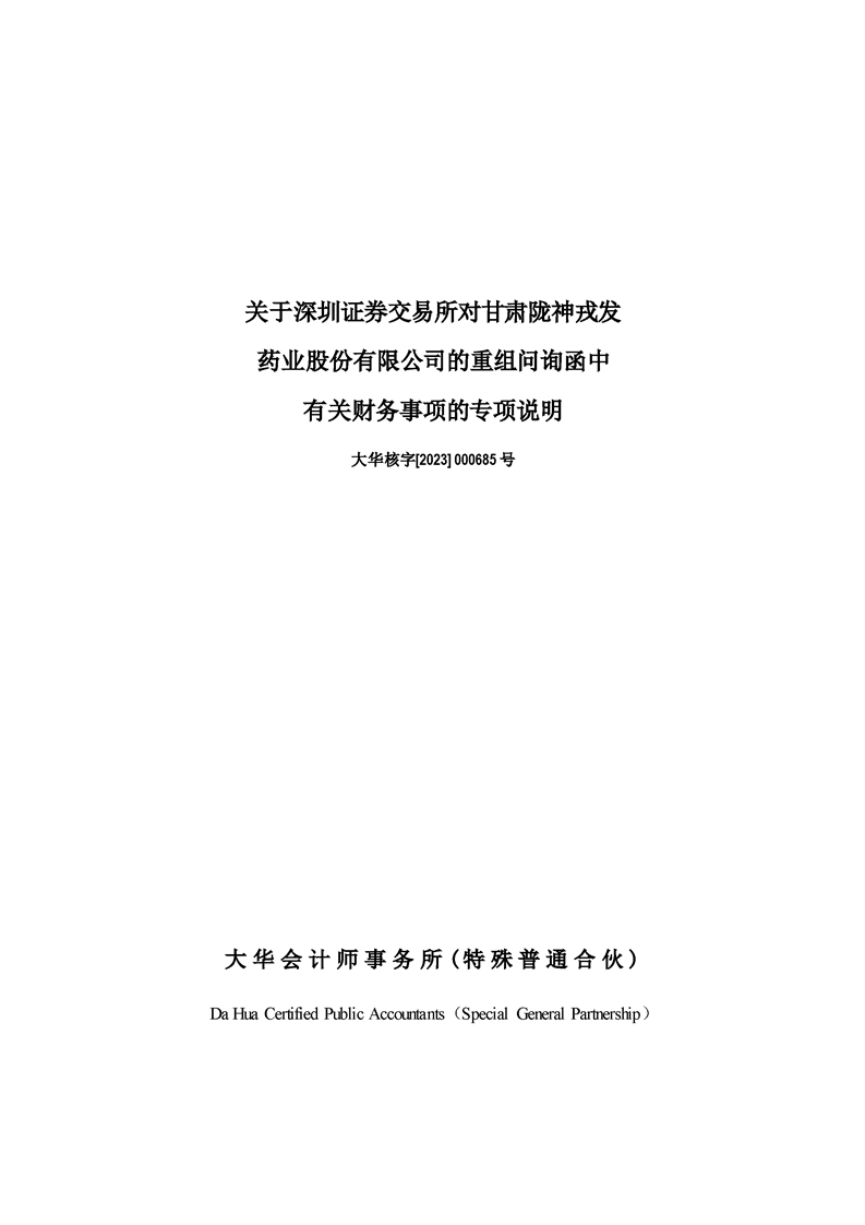 大華會(huì)計(jì)師事務(wù)所關(guān)于深圳證券交易所對甘肅隴神戎發(fā)藥業(yè)股份有限公司的重組問詢函中有關(guān)財(cái)務(wù)事項(xiàng)的專項(xiàng)說明-大華核字[2023]000685號(hào)
