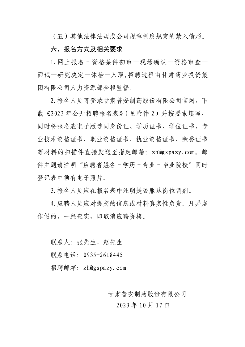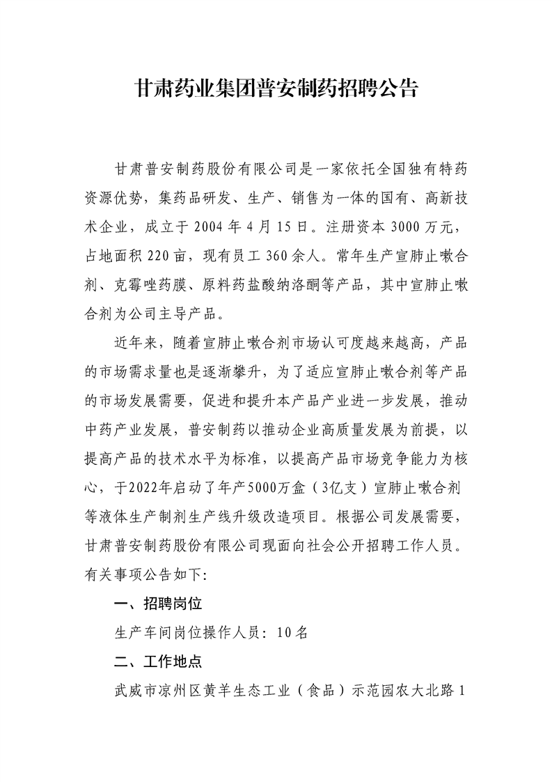 甘肅藥業(yè)集團普安制藥招聘公告