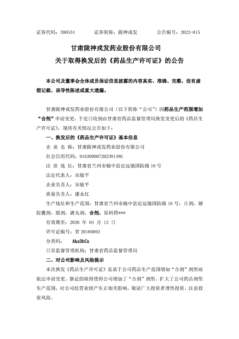 關(guān)于取得換發(fā)后的《藥品生產(chǎn)許可證》的公告