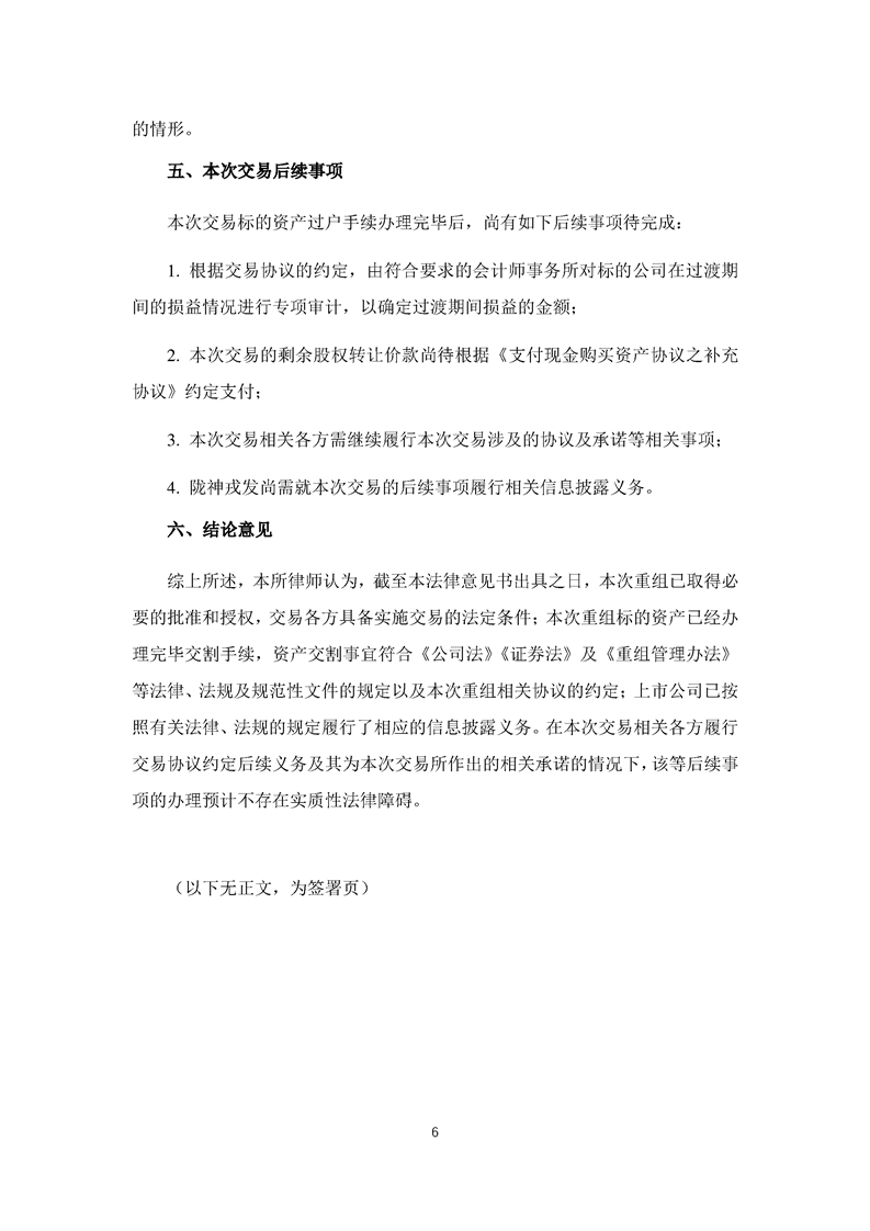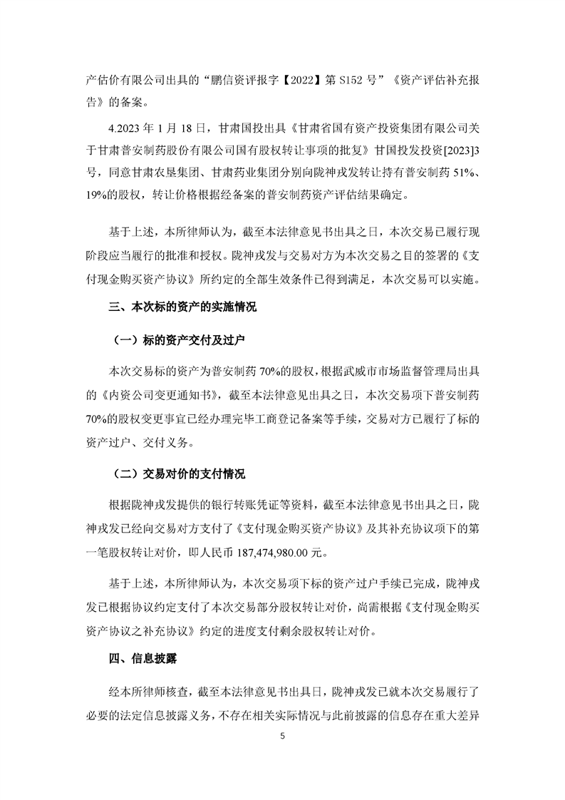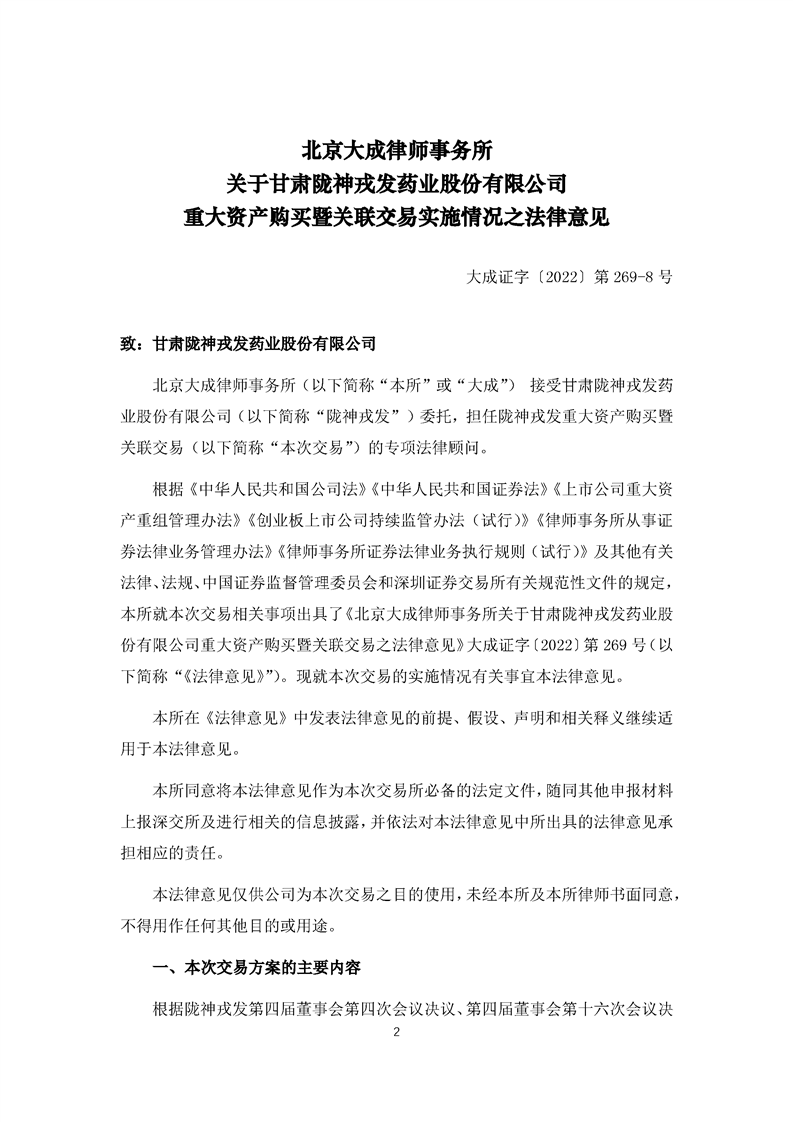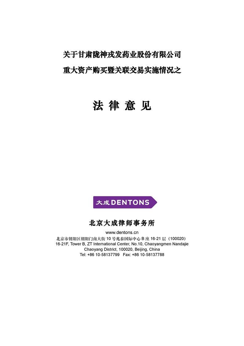 北京大成律師事務(wù)所關(guān)于甘肅隴神戎發(fā)藥業(yè)股份有限公司重大資產(chǎn)購(gòu)買(mǎi)暨關(guān)聯(lián)交易之實(shí)施情況的法律意見(jiàn)