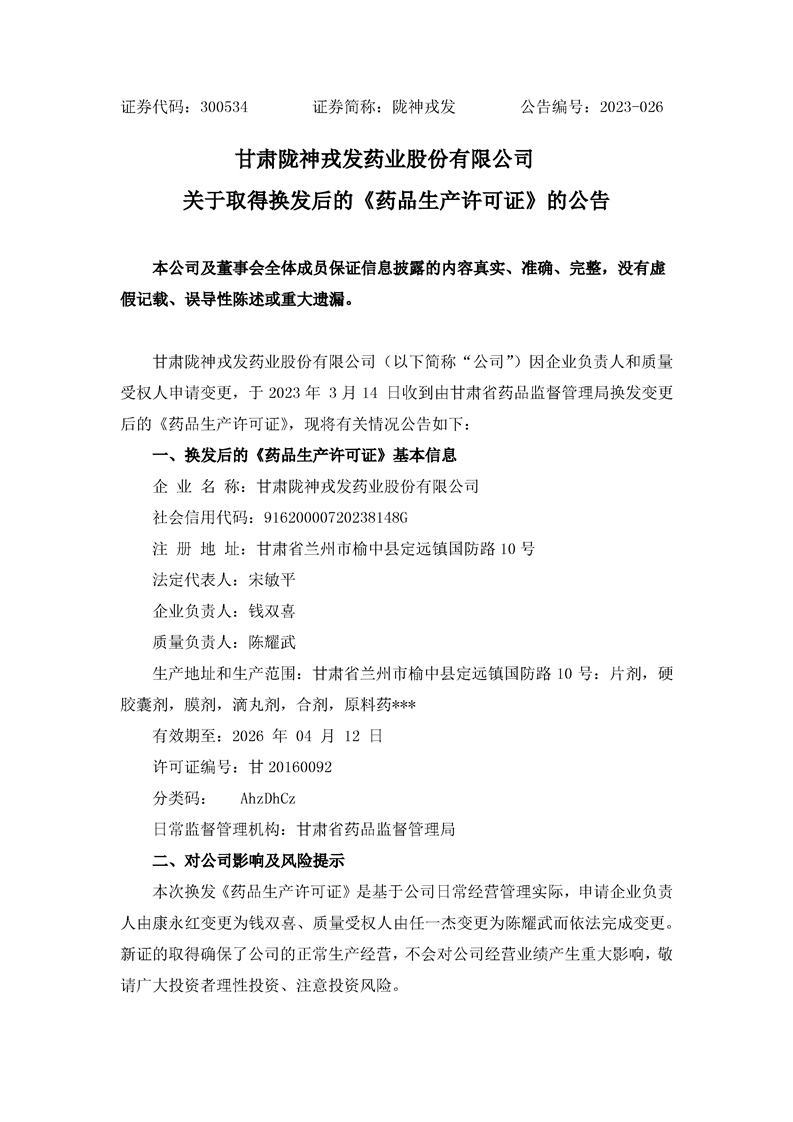 關(guān)于取得換發(fā)后的《藥品生產(chǎn)許可證》的公告
