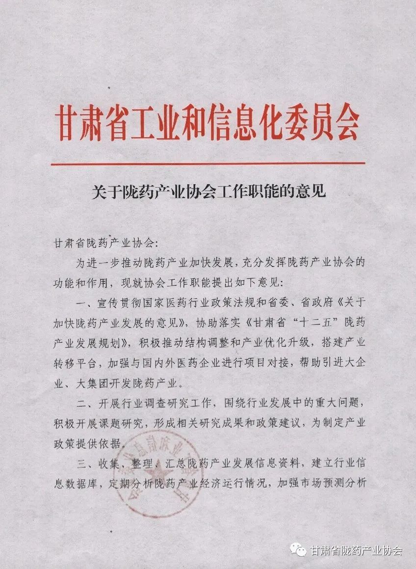 為了加快我省中藥材資源優(yōu)勢(shì)向經(jīng)濟(jì)優(yōu)勢(shì)轉(zhuǎn)化,培育壯大隴藥產(chǎn)業(yè),貫徹國(guó)務(wù)院辦公廳《關(guān)于進(jìn)一步支持甘肅經(jīng)濟(jì)社會(huì)發(fā)展的若干意見(jiàn)》(國(guó)辦【2010】129號(hào))精神,省委省政府于2010年7月制定頒發(fā)了《關(guān)于加快隴藥產(chǎn)業(yè)發(fā)展的意見(jiàn)》,成立了推進(jìn)隴藥產(chǎn)業(yè)發(fā)展協(xié)調(diào)領(lǐng)導(dǎo)小組,科學(xué)布局,主打“隴”字招牌。在甘肅省工信委隴藥辦的主持下,由甘肅奇正實(shí)業(yè)集團(tuán)有限公司、蘭州生物制品研究所、蘭州佛慈制藥股份有限公司、蘭州大得利生化制藥(廠)有限公司及國(guó)藥控股甘肅有限公司為發(fā)起,67家甘肅醫(yī)藥企業(yè)加盟,歷時(shí)一年籌備,甘肅省隴藥產(chǎn)業(yè)協(xié)會(huì)正式成立。