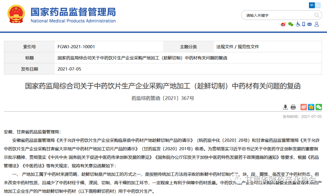 2021年6月,國(guó)家藥監(jiān)局印發(fā)《關(guān)于中藥飲片生產(chǎn)企業(yè)采購(gòu)產(chǎn)地加工(趁鮮切制)中藥材有關(guān)問(wèn)題的復(fù)函》(藥監(jiān)綜藥管函【2021】367號(hào)),允許全國(guó)中藥飲片生產(chǎn)企業(yè)可以采購(gòu)甘肅省全省和安徽省臨泉縣一個(gè)縣、符合條件的產(chǎn)地加工企業(yè)生產(chǎn)的產(chǎn)地趁鮮切制中藥材,用于中藥飲片生產(chǎn),為甘肅中藥材產(chǎn)地加工高質(zhì)量發(fā)展帶來(lái)重大政策支撐。省藥監(jiān)局等10廳局聯(lián)合印發(fā)《甘肅省大宗地產(chǎn)中藥材產(chǎn)地加工(趁鮮切制)工作方案》(甘藥監(jiān)發(fā)【2021】149號(hào)),公布了黃芪、黨參、當(dāng)歸、甘草、大黃、板藍(lán)根、紅芪首批7個(gè)試點(diǎn)品種。隴藥協(xié)會(huì)搶抓這一政策機(jī)遇,組織相關(guān)企業(yè)制定遠(yuǎn)高于現(xiàn)行《中國(guó)藥典》的行業(yè)標(biāo)準(zhǔn),引進(jìn)國(guó)際先進(jìn)加工技術(shù),生產(chǎn)高品質(zhì)當(dāng)歸、黃芪、黨參等大宗地產(chǎn)中藥材及飲片,引領(lǐng)帶動(dòng)全省中藥材產(chǎn)地加工由傳統(tǒng)農(nóng)耕經(jīng)濟(jì)向標(biāo)準(zhǔn)化、工業(yè)化、數(shù)字化、全球化平臺(tái)經(jīng)濟(jì)轉(zhuǎn)型。