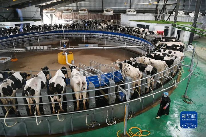 在武威市古浪縣生態(tài)奶牛產(chǎn)業(yè)園的一家企業(yè)牧場,工作人員在轉(zhuǎn)盤式擠奶機旁工作。
