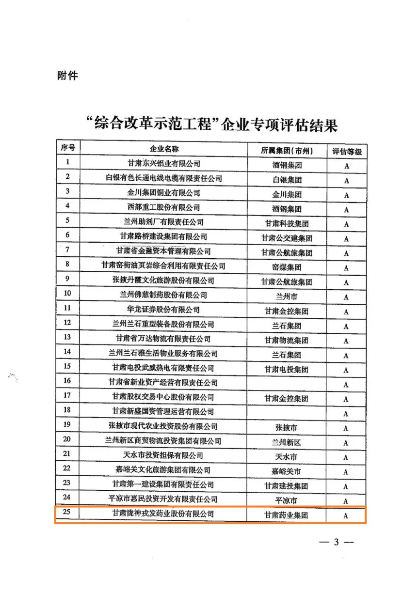 2019年,甘肅省國(guó)資國(guó)企改革推進(jìn)工作領(lǐng)導(dǎo)小組辦公室在全省遴選40戶省屬及省屬二級(jí)企業(yè)和14戶市屬企業(yè),利用三年時(shí)間,深入開展“綜合改革示范工程”,全面落實(shí)國(guó)企改革“1+N”政策文件,緊緊圍繞“五突破一加強(qiáng)”綜合施策深入推進(jìn)改革。近日,經(jīng)甘肅省國(guó)資國(guó)企改革推進(jìn)工作領(lǐng)導(dǎo)小組辦公室會(huì)議研究審定,甘肅隴神戎發(fā)藥業(yè)股份有限公司在“綜合改革示范工程”專項(xiàng)評(píng)估中榮獲A級(jí)評(píng)定。