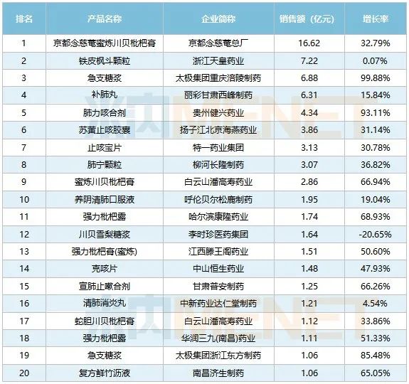 2022年中國城市實(shí)體藥店終端止咳祛痰平喘中成藥品牌TOP20