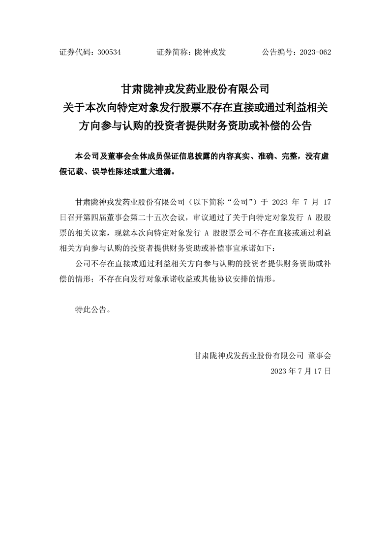 關(guān)于本次向特定對象發(fā)行股票不存在直接或通過利益相關(guān)方向參與認(rèn)購的投資者提供財(cái)務(wù)資助或補(bǔ)償?shù)墓?/h2>