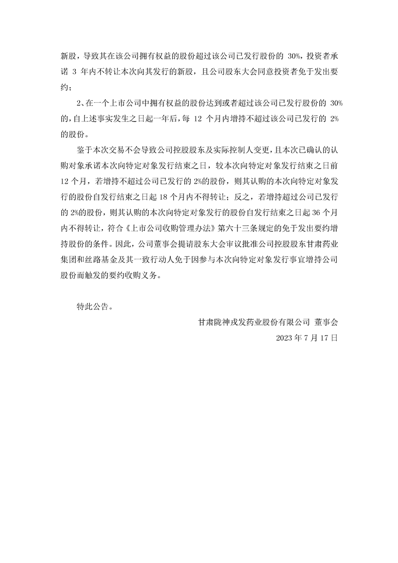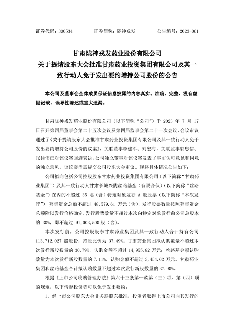 關(guān)于提請(qǐng)股東大會(huì)批準(zhǔn)甘肅藥業(yè)投資集團(tuán)有限公司及其一致行動(dòng)人免于發(fā)出要約增持公司股份的公告