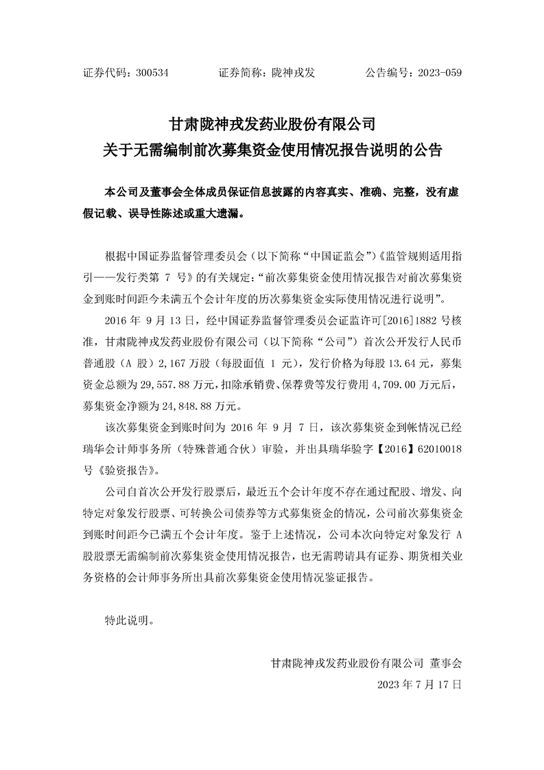關(guān)于無(wú)需編制前次募集資金使用情況報(bào)告說(shuō)明的公告
