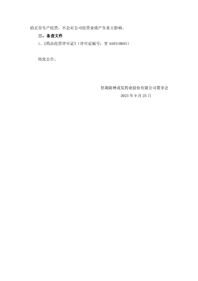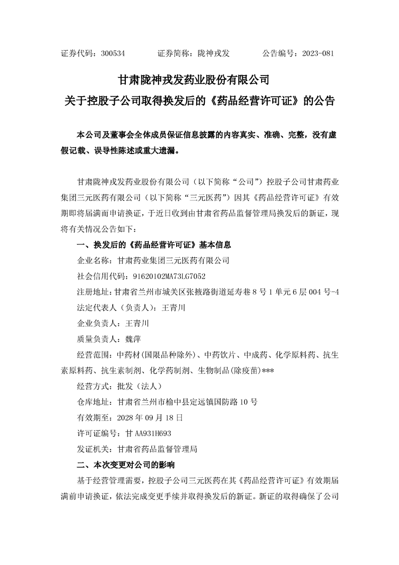 關(guān)于控股子公司取得換發(fā)后的《藥品經(jīng)營許可證》的公告