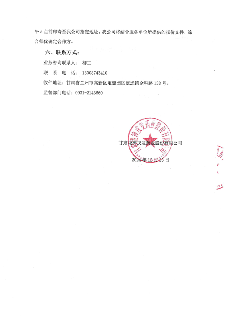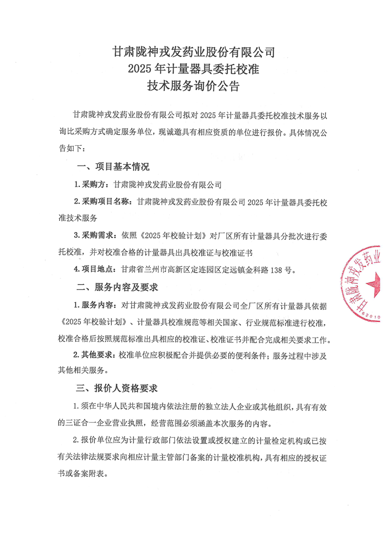 甘肅隴神戎發(fā)藥業(yè)股份有限公司2025年計(jì)量器具委托校準(zhǔn)技術(shù)服務(wù)詢(xún)價(jià)公告