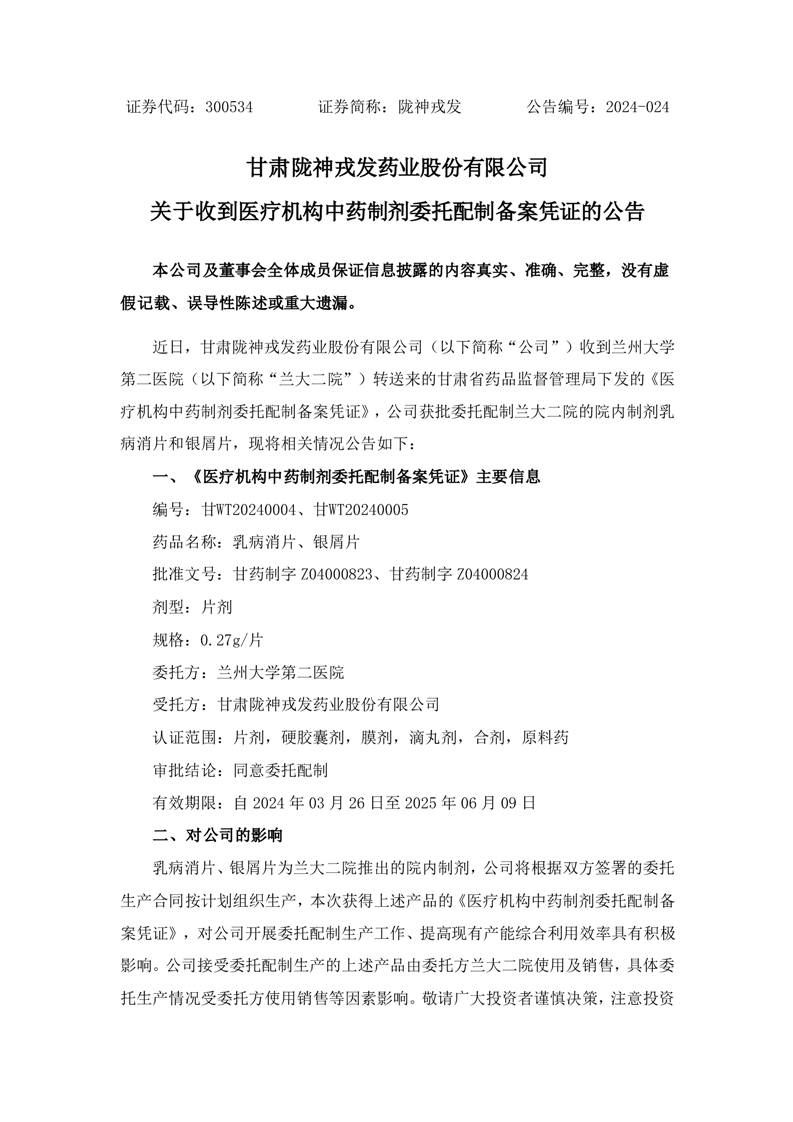 關(guān)于收到醫(yī)療機(jī)構(gòu)中藥制劑委托配制備案憑證的公告