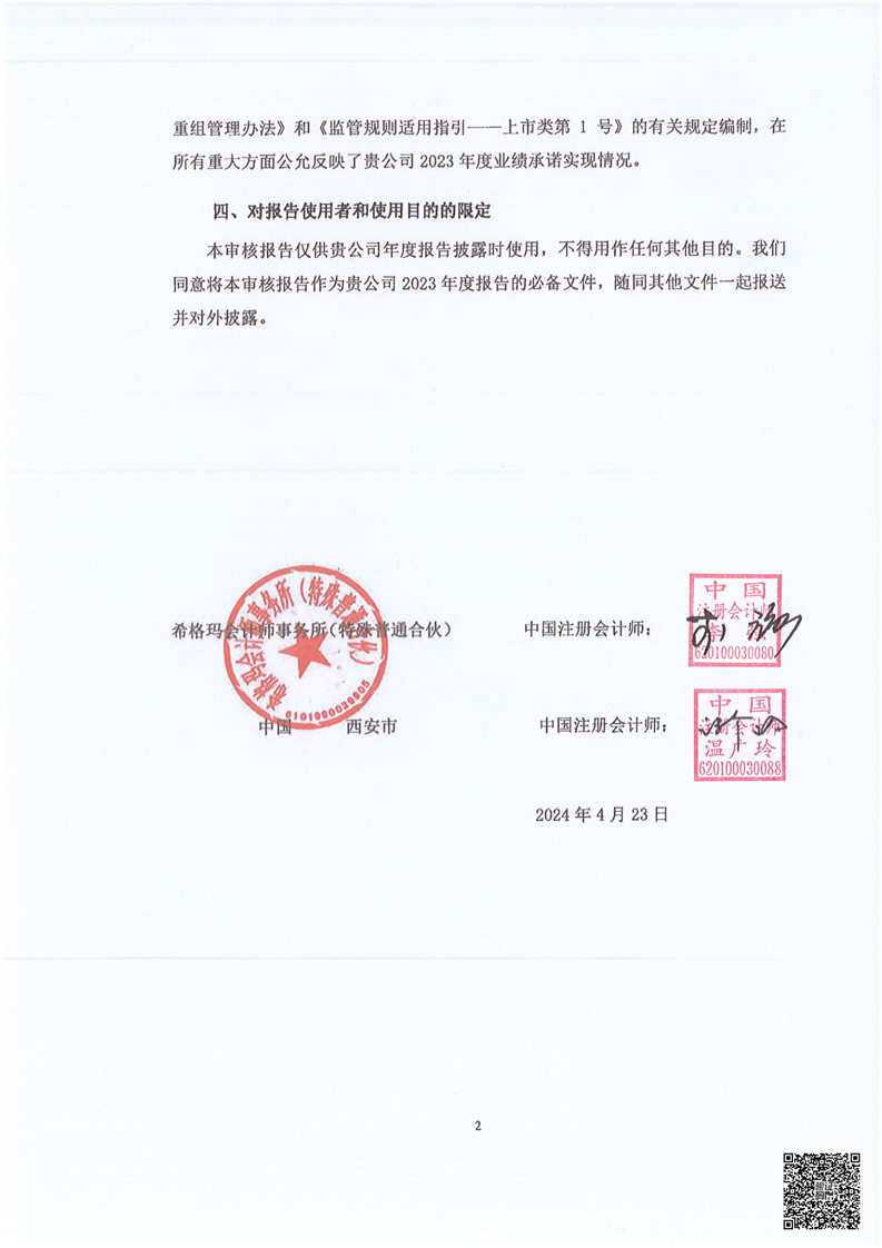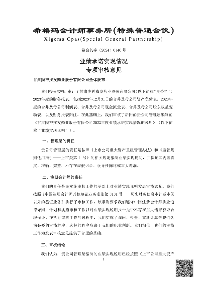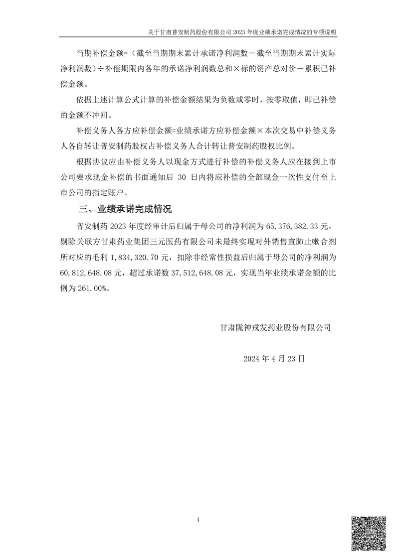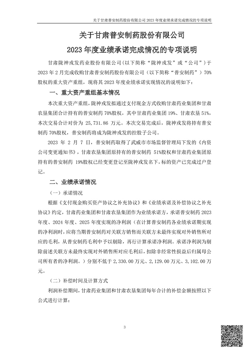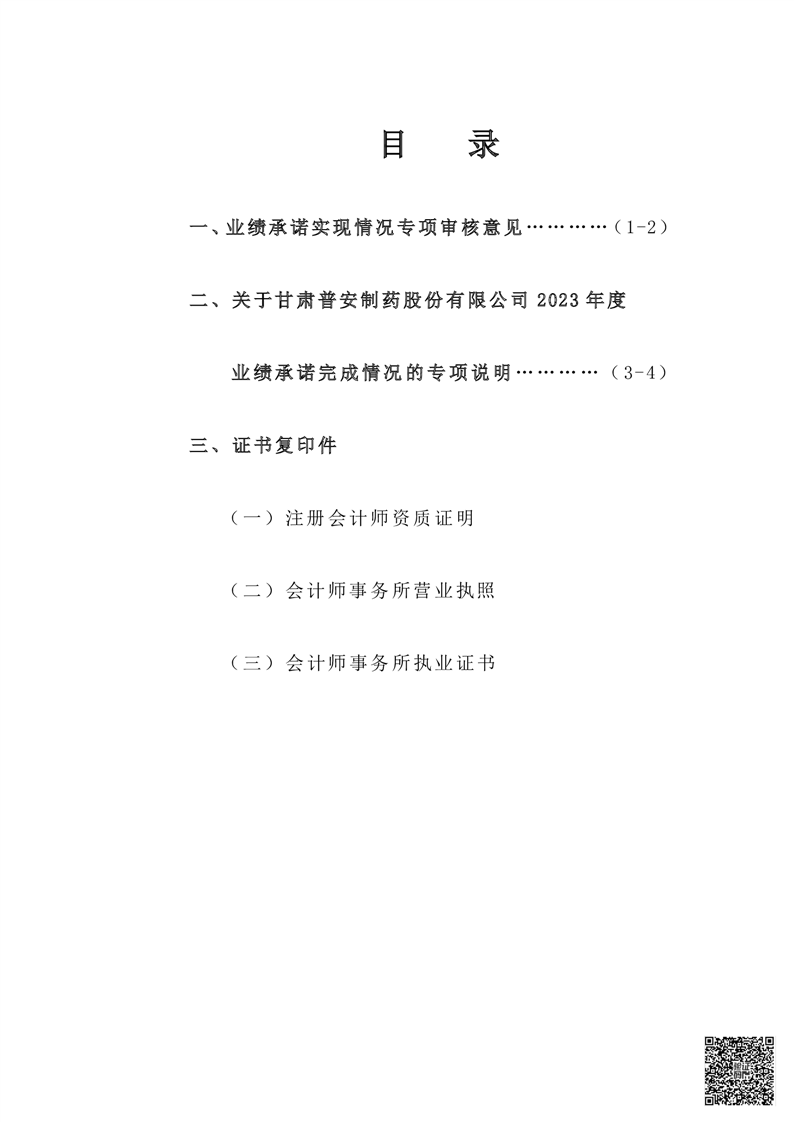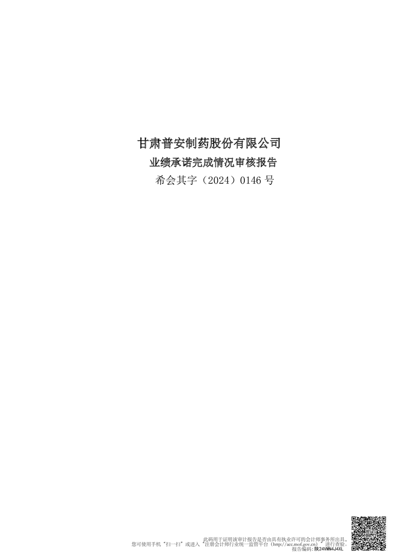 甘肅普安制藥股份有限公司業(yè)績承諾完成情況審核報告(更正后)