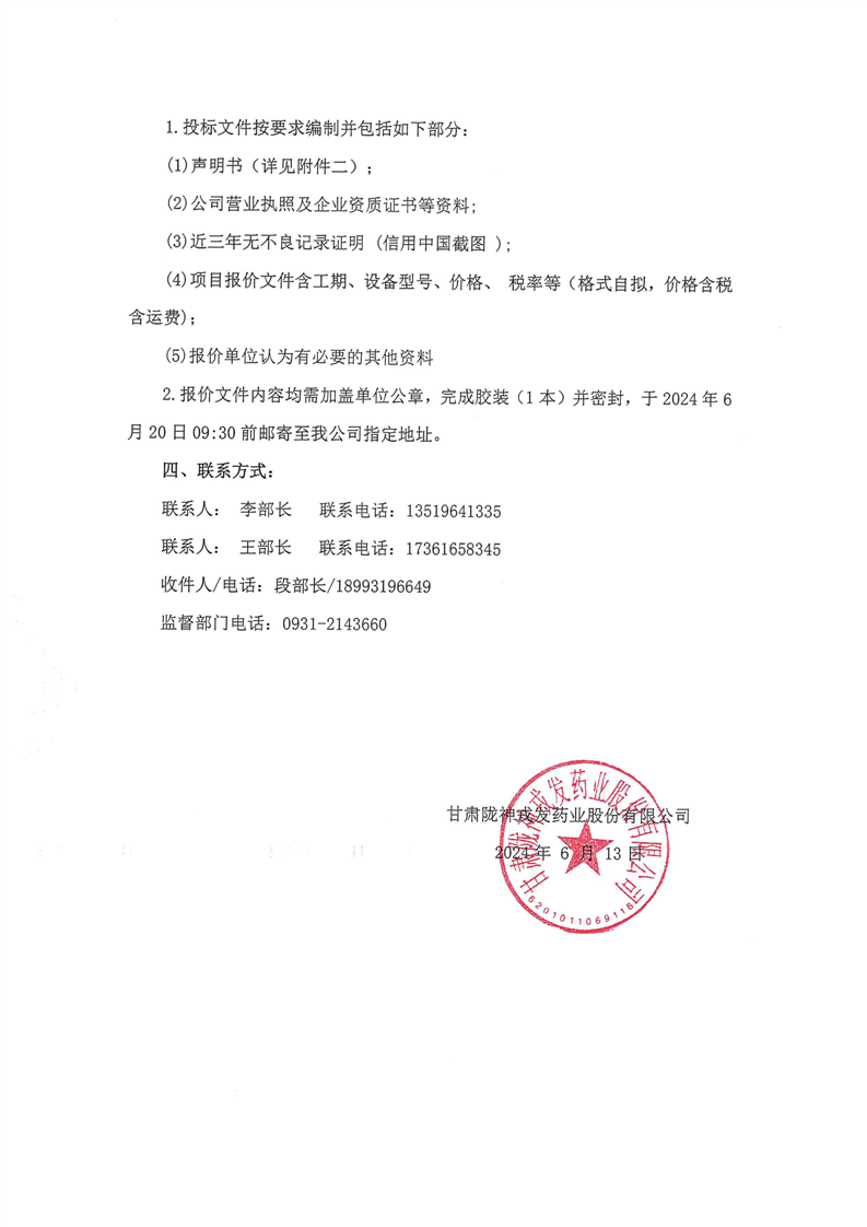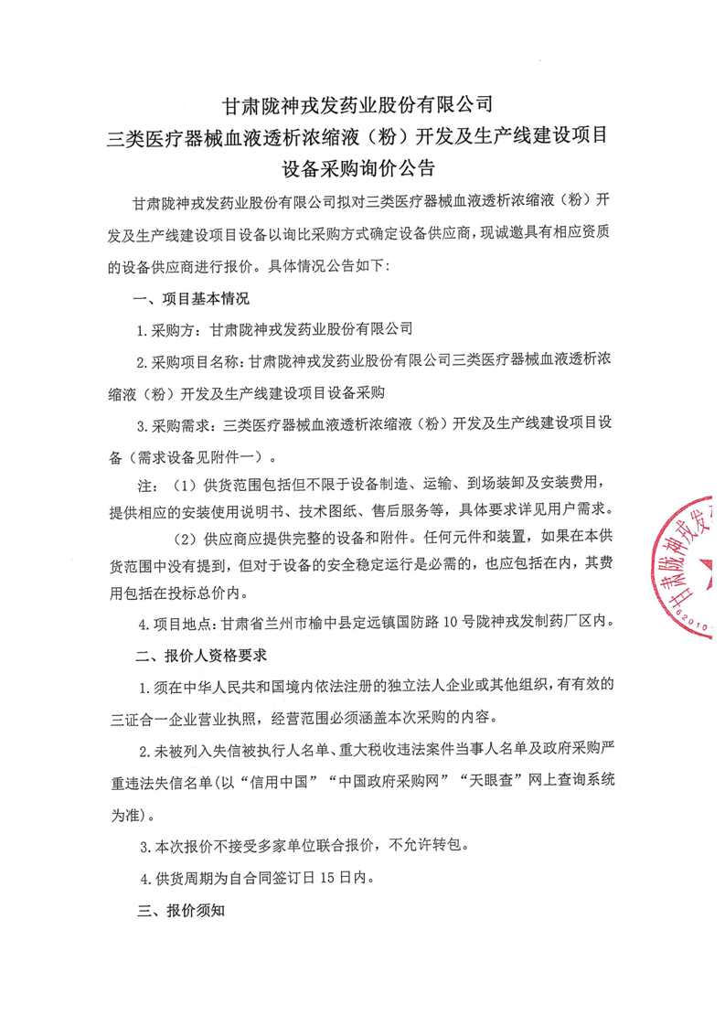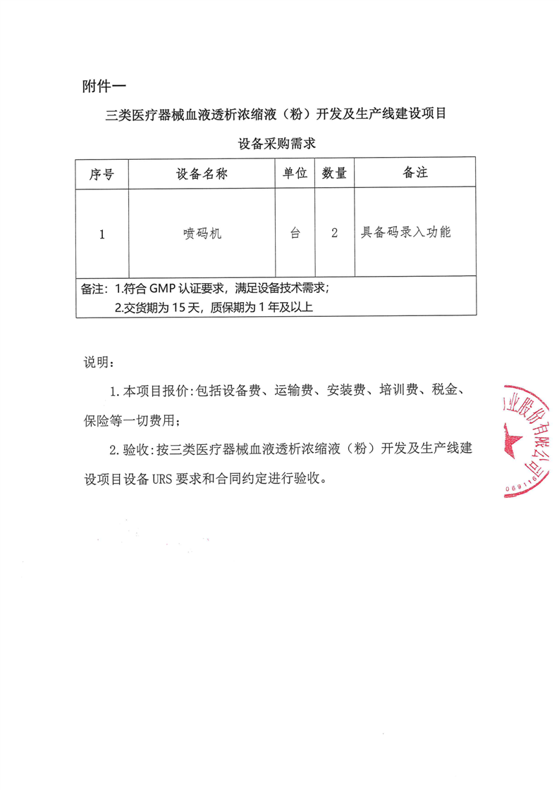 甘肅隴神戎發(fā)藥業(yè)股份有限公司三類醫(yī)療器械血液透析濃縮液(粉)開(kāi)發(fā)及生產(chǎn)線建設(shè)項(xiàng)目設(shè)備采購(gòu)詢價(jià)公告(噴碼機(jī))
