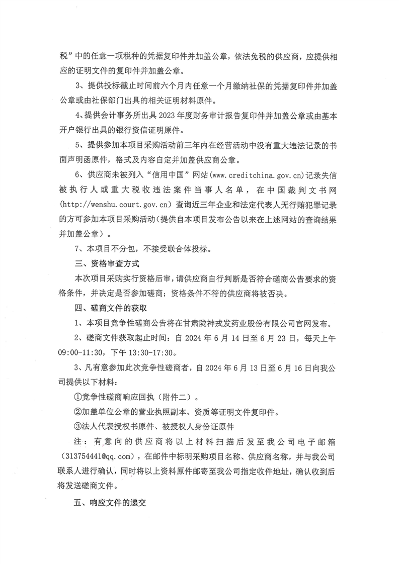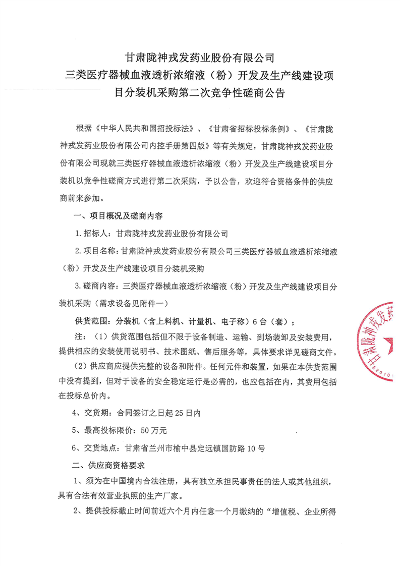 甘肅隴神戎發(fā)藥業(yè)股份有限公司三類醫(yī)療器械血液透析濃縮液(粉)開發(fā)及生產(chǎn)線建設(shè)項目分裝機采購第二次競爭性磋商公告