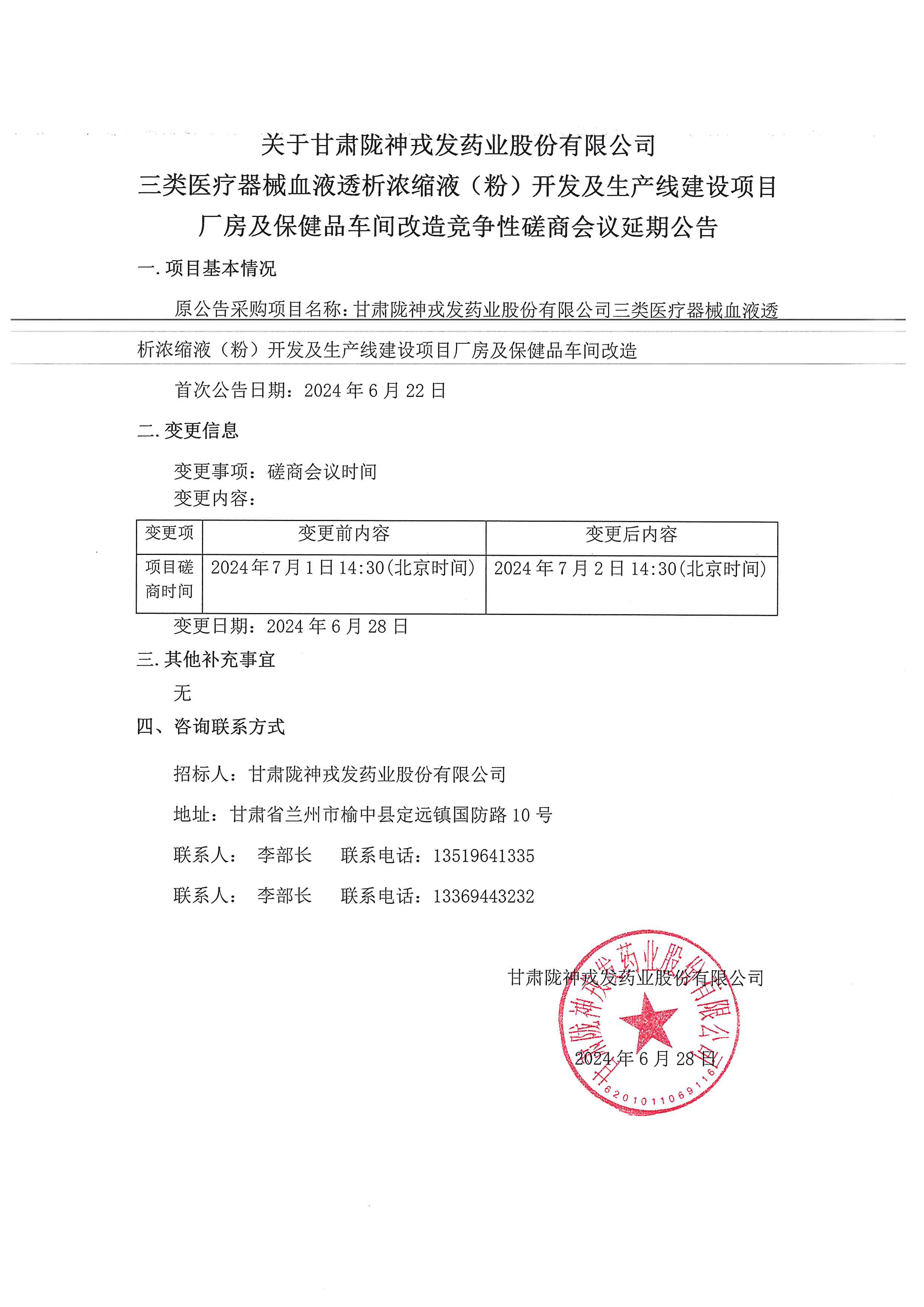 關(guān)于甘肅隴神戎發(fā)藥業(yè)股份有限公司三類(lèi)醫(yī)療器械血液透析濃縮液(粉)開(kāi)發(fā)及生產(chǎn)線建設(shè)項(xiàng)目廠房及保健品車(chē)間改造競(jìng)爭(zhēng)性磋商會(huì)議延期公告