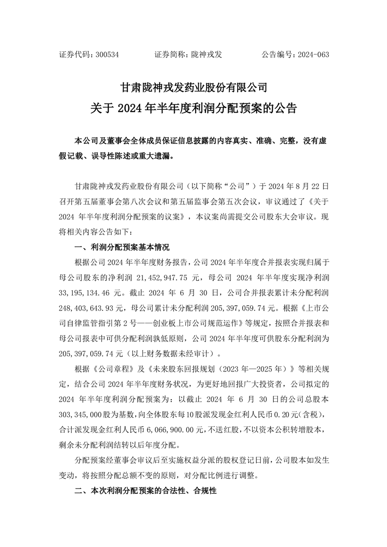 關(guān)于2024年半年度利潤(rùn)分配預(yù)案的公告