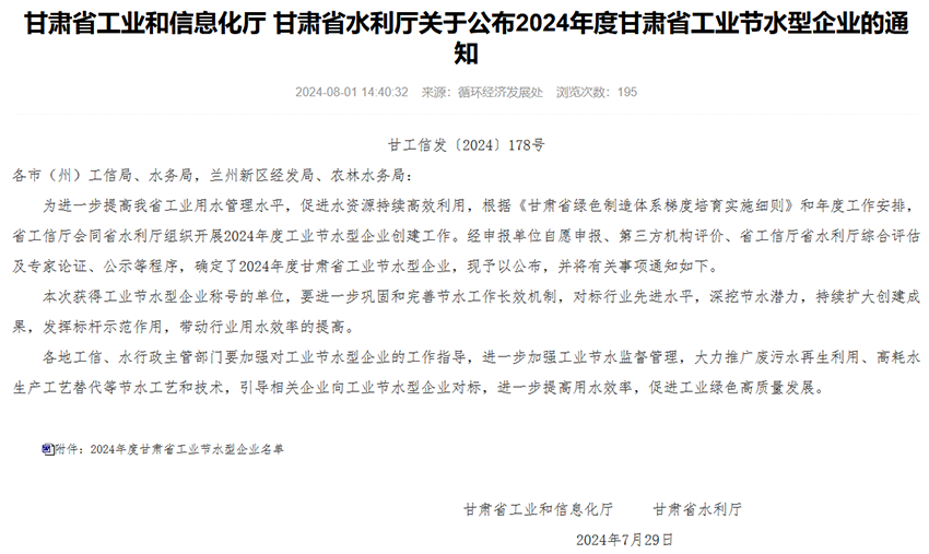 近日,省工信廳和省水利廳聯(lián)合發(fā)文,表彰了一批2024年甘肅省工業(yè)節(jié)水型企業(yè),我公司榜上有名,榮獲“甘肅省工業(yè)節(jié)水型企業(yè)”稱號。