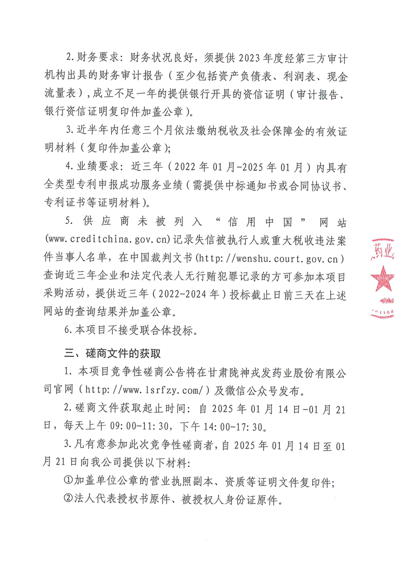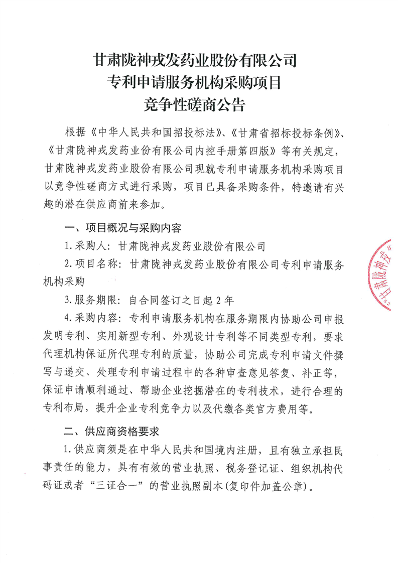 甘肅隴神戎發(fā)藥業(yè)股份有限公司專利申請(qǐng)服務(wù)機(jī)構(gòu)采購項(xiàng)目競(jìng)爭(zhēng)性磋商公告