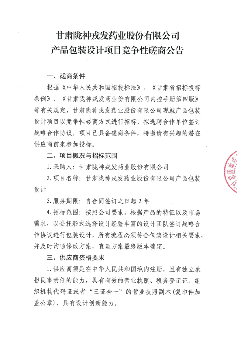 甘肅隴神戎發(fā)藥業(yè)股份有限公司產(chǎn)品包裝設(shè)計(jì)項(xiàng)目競(jìng)爭(zhēng)性磋商公告