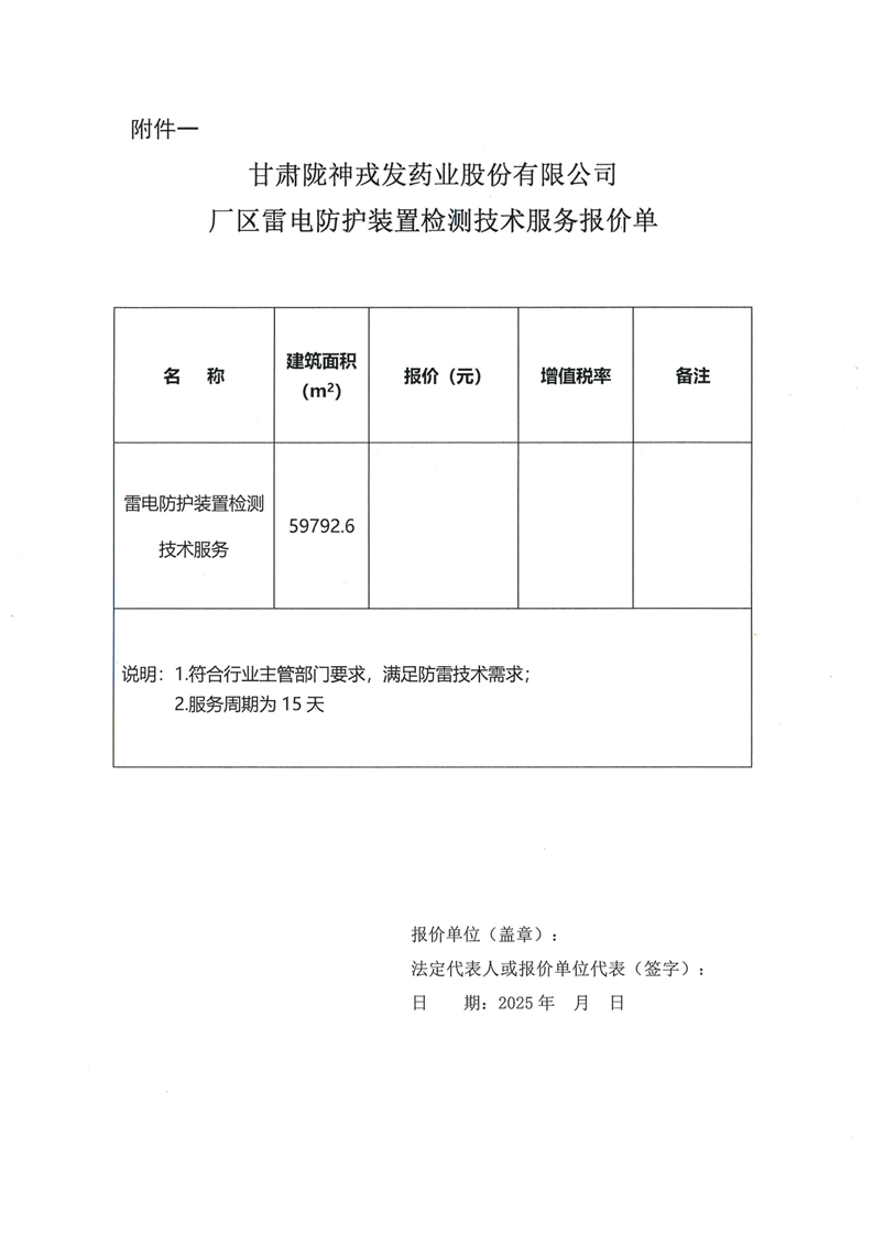 甘肅隴神戎發(fā)藥業(yè)股份有限公司廠區(qū)雷電防護(hù)裝置檢測(cè)技術(shù)服務(wù)詢(xún)價(jià)公告