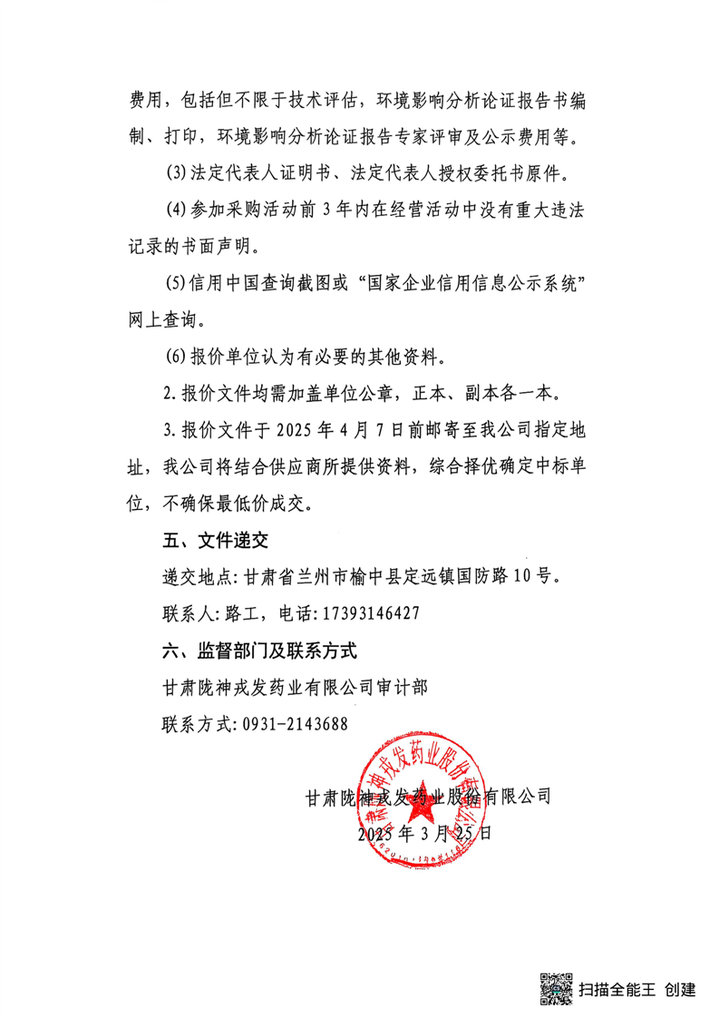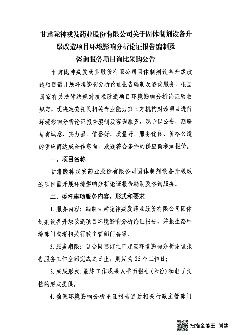 甘肅隴神戎發(fā)藥業(yè)股份有限公司關(guān)于固體制劑設(shè)備升級(jí)改造項(xiàng)目環(huán)境影響分析論證報(bào)告編制及咨詢服務(wù)項(xiàng)目詢比采購(gòu)公告